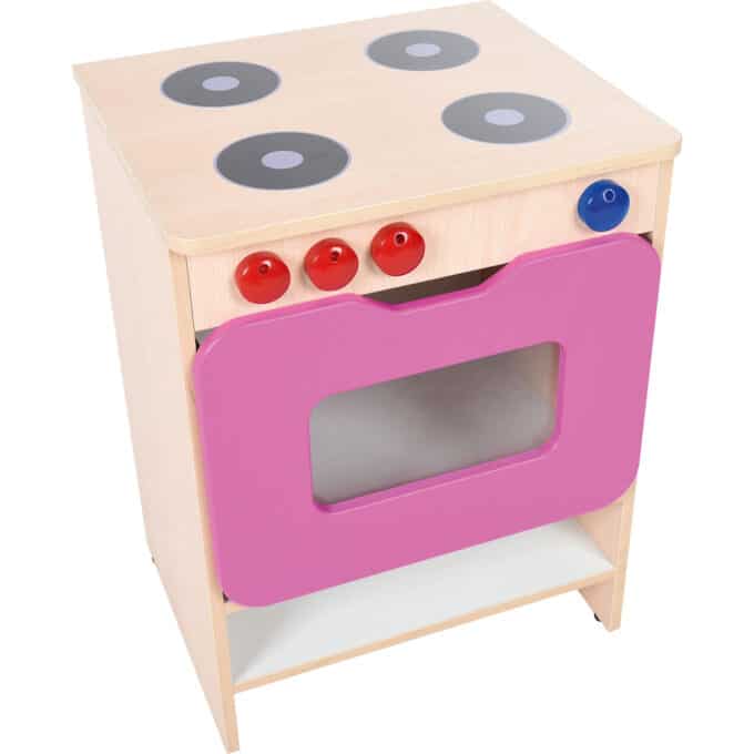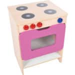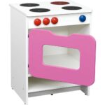 Dieser charmante Herd bietet kleinen Meisterköchen die Möglichkeit, spielerisch zu kochen und zu backen. Die Plexiglasscheibe an der Türfront ermöglicht einen realistischen Blick in den „Backofen,“ während die robuste Bauweise aus laminiertem Spanholz und farbenfrohen MDF-Fronten für Langlebigkeit und Sicherheit sorgt. Die geräumige Ablage und die authentischen Details machen das Spielen noch spannender.