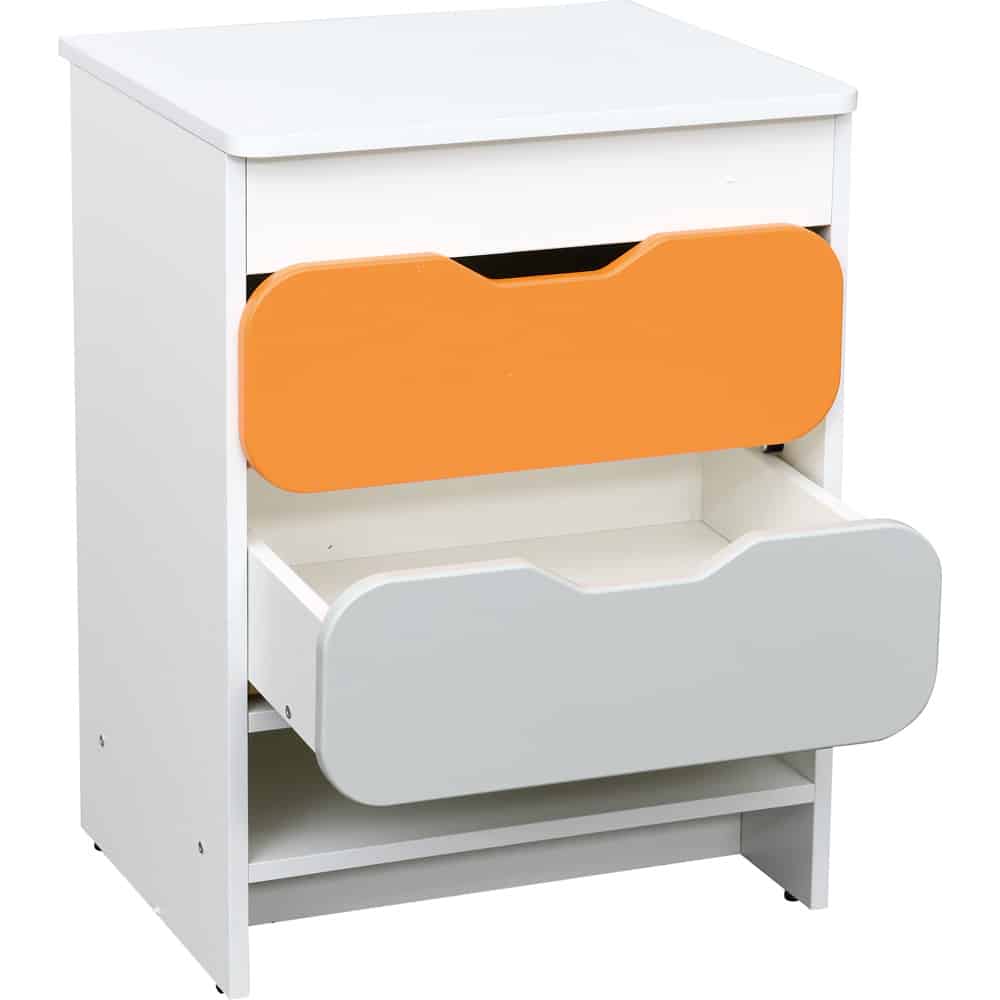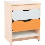 Der farbenfrohe Schubladenschrank bietet kleinen Küchenchefs die Möglichkeit, spielerisch Ordnung zu halten und die wichtigen Dinge ihrer Spielküche gut zu verstauen. Die beiden geräumigen Schubladen und die zusätzliche Ablage bieten ausreichend Platz für all die kleinen Küchenutensilien. Dank der robusten Bauweise aus laminiertem Spanholz und farbenfrohen MDF-Fronten ist der Schrank langlebig und sicher.