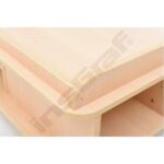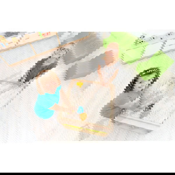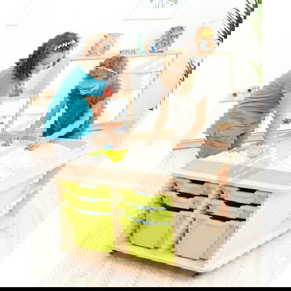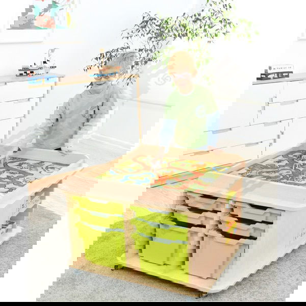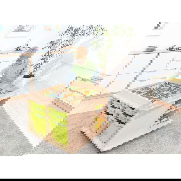 Dieser Tisch bietet sowohl Platz zum Spielen, als auch Stauraum. Die Spielmatten eignen sich für die Deckplatte; diese bildet auch die ideale Unterlage zum Spiel mit der Holzeisenbahn (z.B. 575001–575003) oder mit Holzbausteinen (u.a. 542015 -542019). Im Unterbau befinden sich an zwei gegenüberliegenden Seiten Regalteile. Große offene Fächer können individuell mit unseren Kunststoffbehältern (372009 – 372025) ausgestattet werden; passende Führungsschienen werden mit den Behältern geliefert.