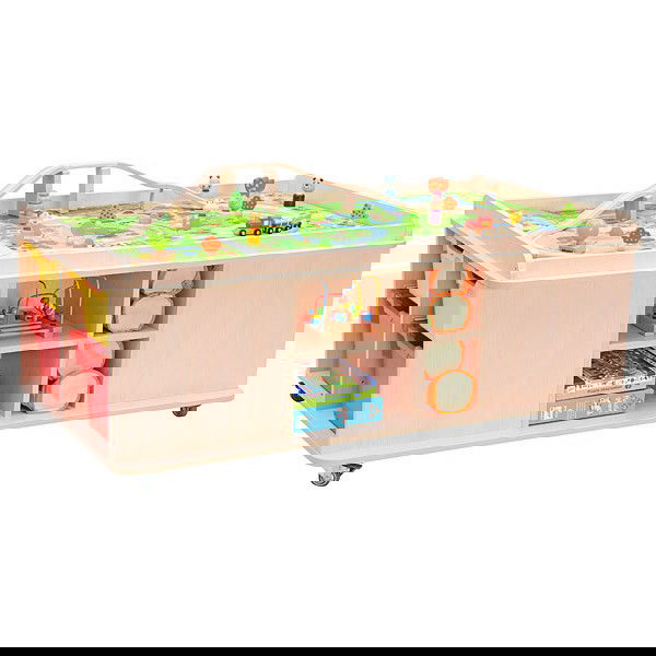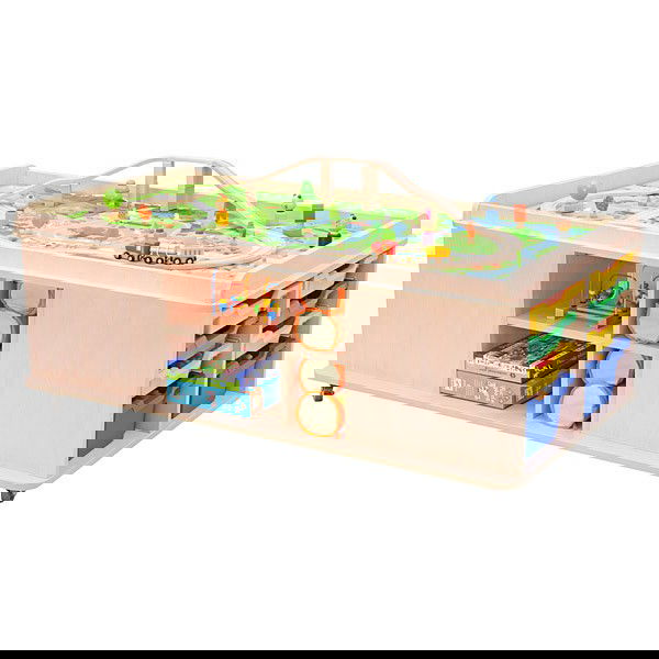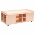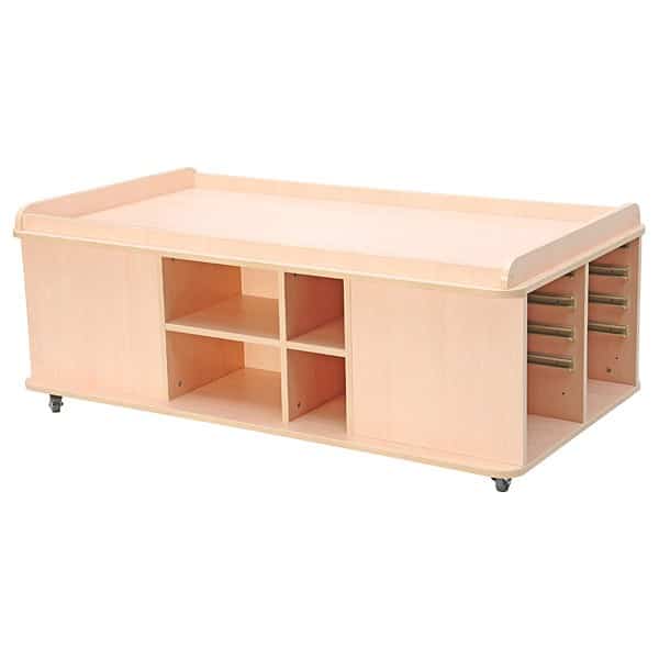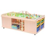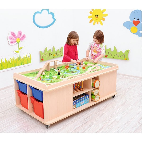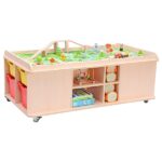 Dieser Tisch bietet sowohl Platz zum Spielen, als auch Stauraum. Die Spielmatten eignen sich für die Deckplatte; diese bildet auch die ideale Unterlage zum Spiel mit der Holzeisenbahn (z.B. 575001–575003) oder mit Holzbausteinen (u.a. 542015 -542019). Im Unterbau befinden sich an zwei gegenüberliegenden Seiten Regalteile. Große offene Fächer können individuell mit unseren Kunststoffbehältern (372009 – 372025) ausgestattet werden; passende Führungsschienen werden mit den Behältern geliefert.