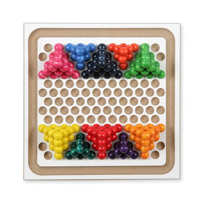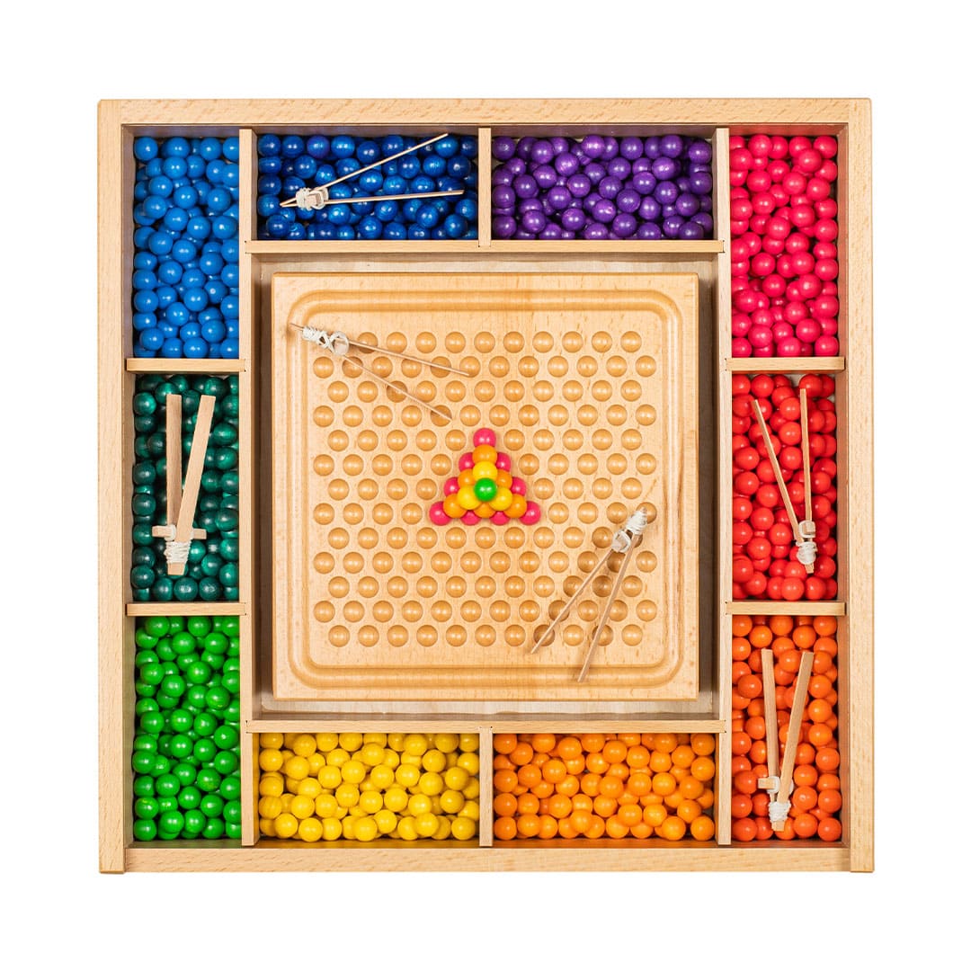 - Inhalt: Ca. 1250 Holzkugeln, 10 mm Durchmesser in 10 leuchtenden Farben des Regenbogens. 5 Legetabletts 175 x 175 x 10 mm – auf jeder Seite bespielbar. 5 Spielanleitungen. 5 Pinzetten zum selber basteln.