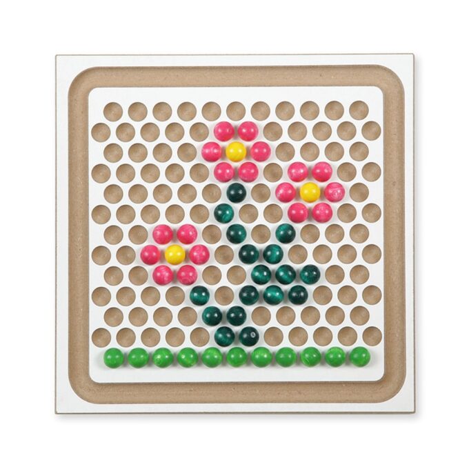 Kleine Künstler können mit Hilfe der filigranen Pinzetten oder einfach mit ihren Fingern die bunten Holzkugeln auf die Tabletts setzen. Auf der einen Seite sind Mulden in geraden Reihen vorhanden, ideal für das Sortieren nach Farben, das Zählen oder das Erstellen symmetrischer Muster. Die andere Seite hingegen präsentiert versetzte Vertiefungen, die es fortgeschrittenen kleinen Baumeistern ermöglichen, Kugeln zu stapeln und so beeindruckende dreidimensionale Strukturen zu erschaffen.