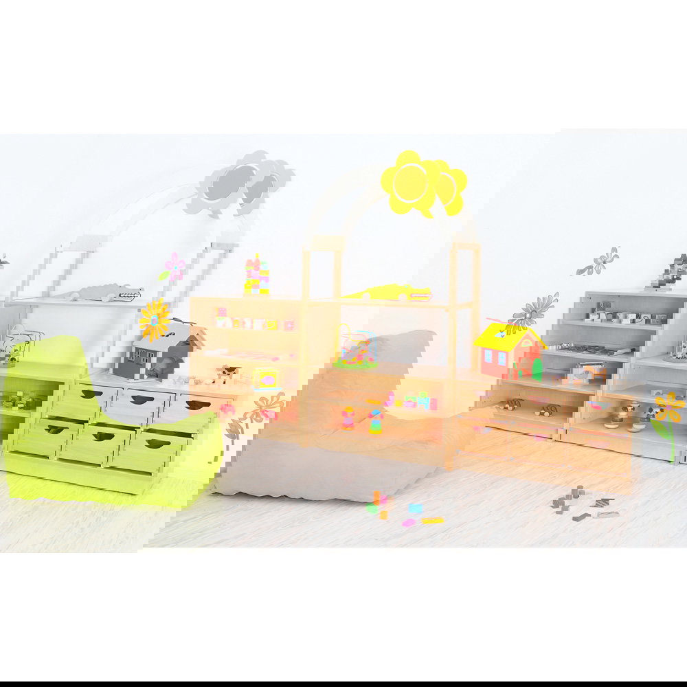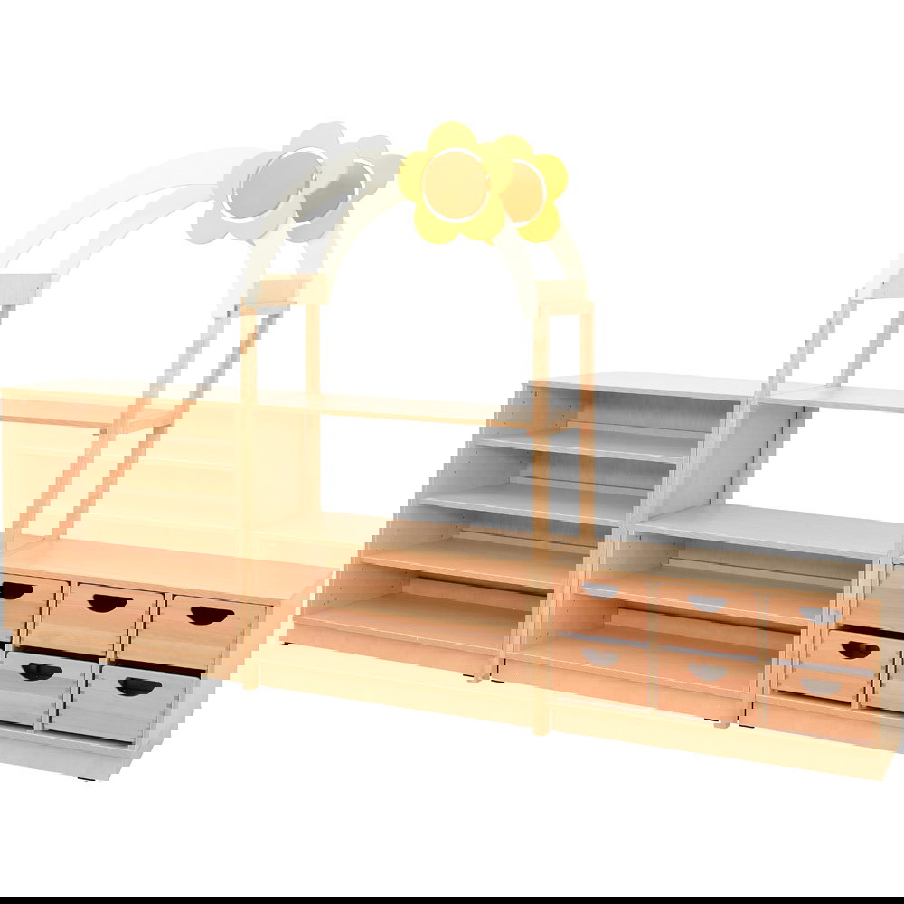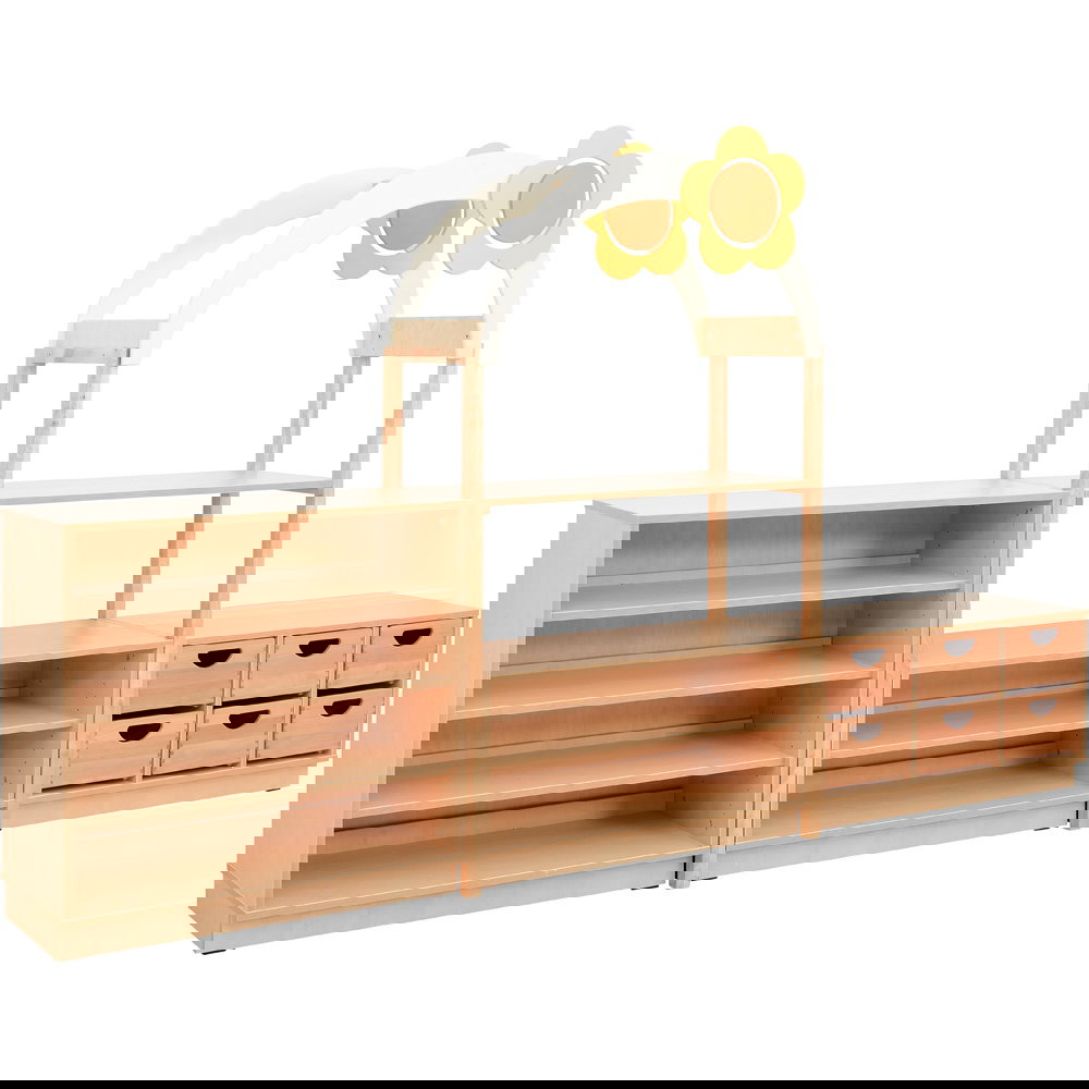 Als Teil der innovativen Flexi-Kollektion steht dieser Möbelsatz für wandelbare Multifunktionsmöbel, die Ihnen völlige Freiheit bei der Raumgestaltung einräumen. Das charmante Design mit dem ansprechenden Bogen-Dach und der aufgesetzten Blume regt die Fantasie an und schafft eine absolute Wohlfühlatmosphäre. Mit einer stattlichen Gesamtbreite von 2,75 Metern nutzt das Set den vorhandenen Platz optimal aus. Im Handumdrehen auf- und umgestellt, erschaffen Sie immer wieder neue, spannende Raumbereiche.