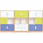 Fertigung aus hochwertiger, laminierter Spanplatte garantiert Langlebigkeit und einfache Pflege. Die weißen Einlegeböden und Trennwände harmonieren perfekt mit den farbigen Türen, die mit praktischen Muschelgriffen ausgestattet sind. Der Möbelsatz hilft Ihnen, Spielzeug, Lernmaterialien und vieles mehr ordentlich und griffbereit zu verstauen.
