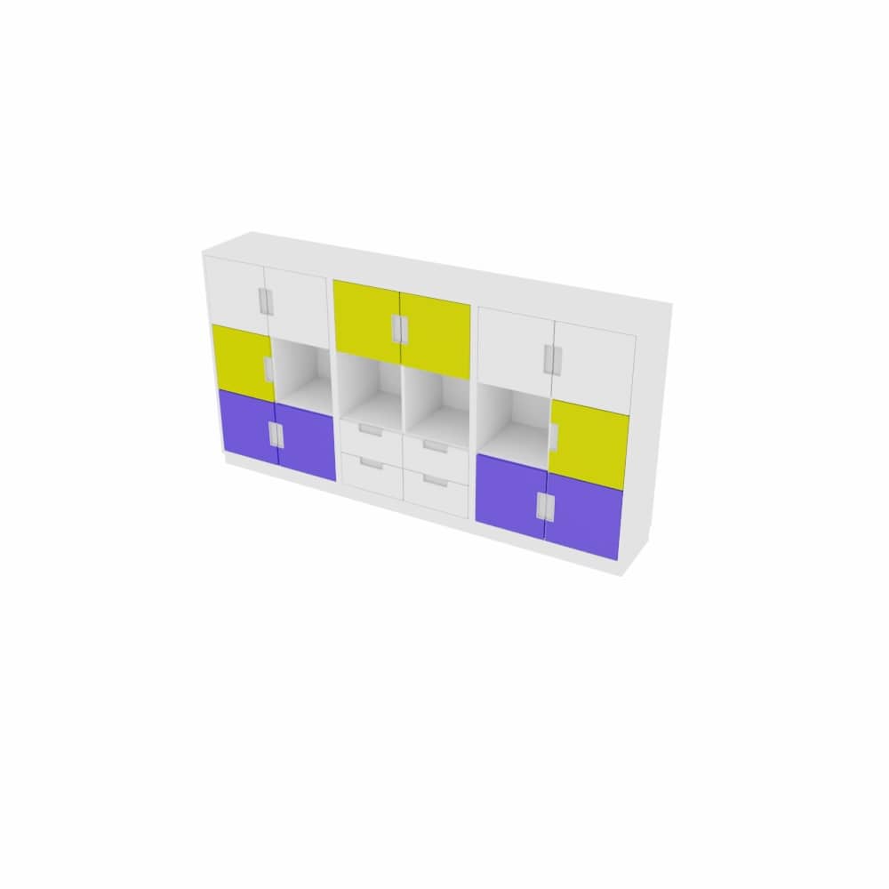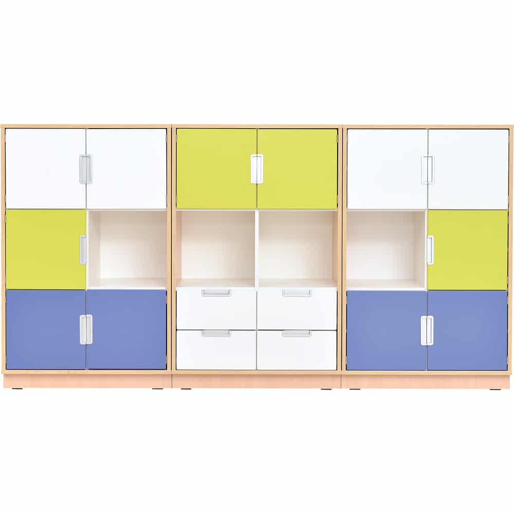 Der Möbelsatz Quadro 13-180° bietet eine vielfältige und strukturierte Lösung für Ihre Aufbewahrungsbedürfnisse. Perfekt für Kindergärten, Schulen und auch Zuhause, überzeugt dieser Möbelsatz durch seine Farbvielfalt und hohe Funktionalität.