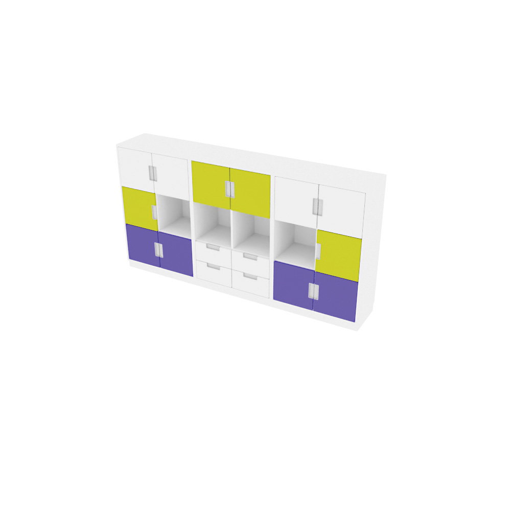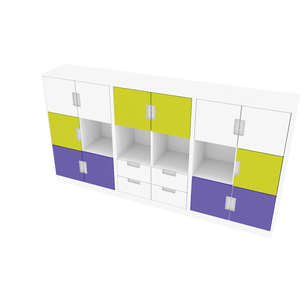 Das funktionale Herzstück dieser Schrankwand bilden drei nebeneinanderliegende L-Schränke. Jeder dieser Schränke ist mit einer stabilen Mittelwand und vier Einlegeböden ausgestattet, wodurch eine Vielzahl an flexiblen Fächern entsteht. Ein besonderer Blickfang ist die frische, motivierende Farbgestaltung. Die zwölf kleinen Türen in den Farben Weiß, Limone und Blau setzen fröhliche Akzente, ohne aufdringlich zu wirken. Ergänzt wird das System durch vier schmale, weiße Schubladen, die sich hervorragend für die Aufbewahrung von Stiften, Papier oder kleineren Spielsachen eignen.