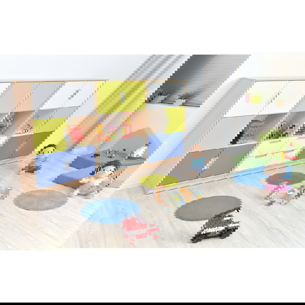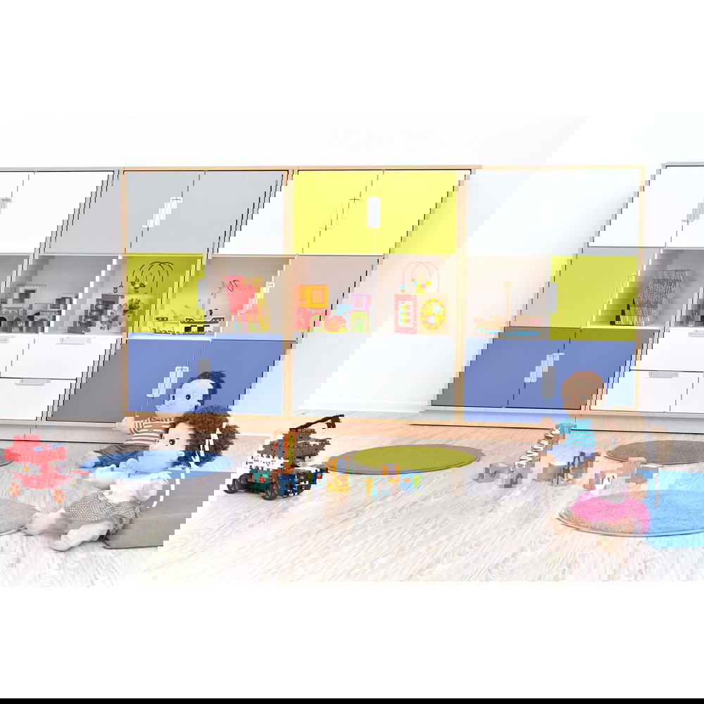 Die farbigen Fronten in Weiß, Blau und Limone sehen nicht nur ansprechend aus, sondern helfen den Kindern auch dabei, sich besser zu orientieren. Bestimmte Materialien lassen sich farblich zuordnen, was das gemeinsame Aufräumen deutlich erleichtert und beschleunigt. - Höchste Materialqualität und Langlebigkeit