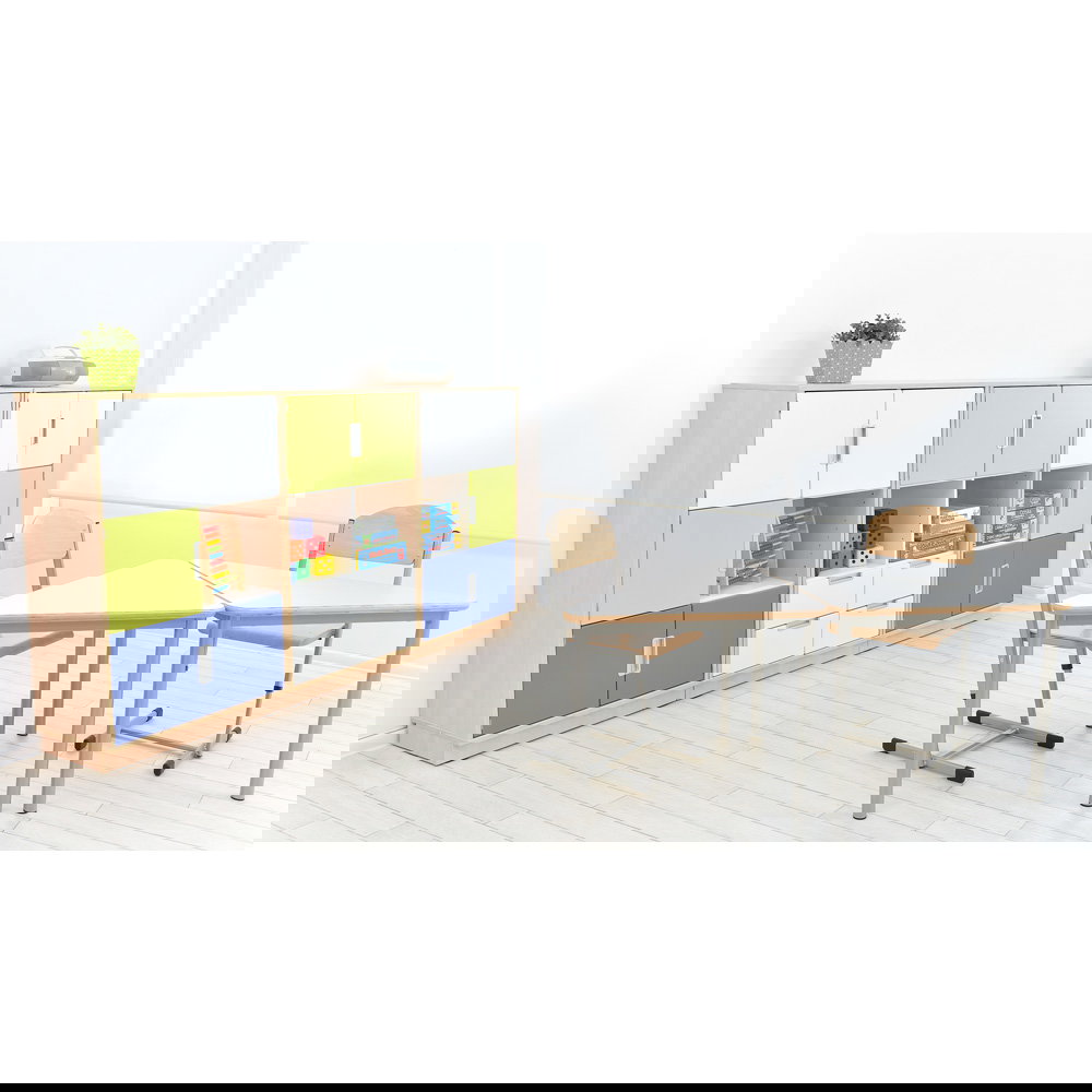 Eine gut strukturierte Umgebung bildet die ideale Grundlage für konzentriertes Lernen und unbeschwertes Spielen. Der Möbelsatz Quadro 13/13W vereint genau diese Aspekte in einem kompakten, aber äußerst geräumigen Design. Auf einer Gesamtbreite von knapp 2,38 Metern bietet dieses durchdachte System viel Platz, um Spielsachen, Bücher und Bastelmaterialien ordentlich zu verstauen. Durch seine mittelhohe Bauweise von 124,2 Zentimetern bleibt der Raum offen und freundlich, während die Kinder gleichzeitig mühelosen Zugriff auf ihre Materialien haben. Dies fördert die Selbstständigkeit im Alltag von Kindergärten, Schulen oder modernen Betreuungseinrichtungen.