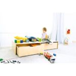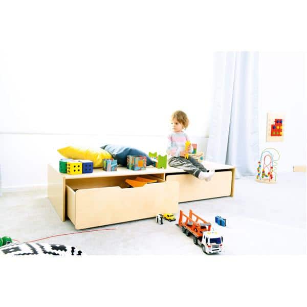 Mit den Podesten wird zusätzlicher Stauraum geschaffen. Die großen, ausziehbaren Schübe sind sicher unter dem Podest verstaut, während darauf gespielt werden kann. Mit Verbindungsklammern, die das Verrutschen zweier Podeste verhindern. Schübe mit 4 versenkten Rollen (Durchmesser: 3 cm) – separat zu bestellen.