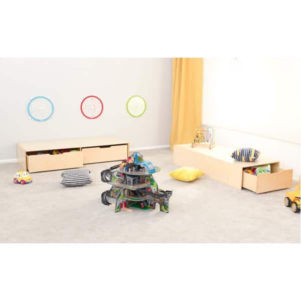 Mit den Podesten wird zusätzlicher Stauraum geschaffen. Die großen, ausziehbaren Schübe sind sicher unter dem Podest verstaut, während darauf gespielt werden kann. Mit Verbindungsklammern, die das Verrutschen zweier Podeste verhindern. Schübe mit 4 versenkten Rollen (Durchmesser: 3 cm) – separat zu bestellen.