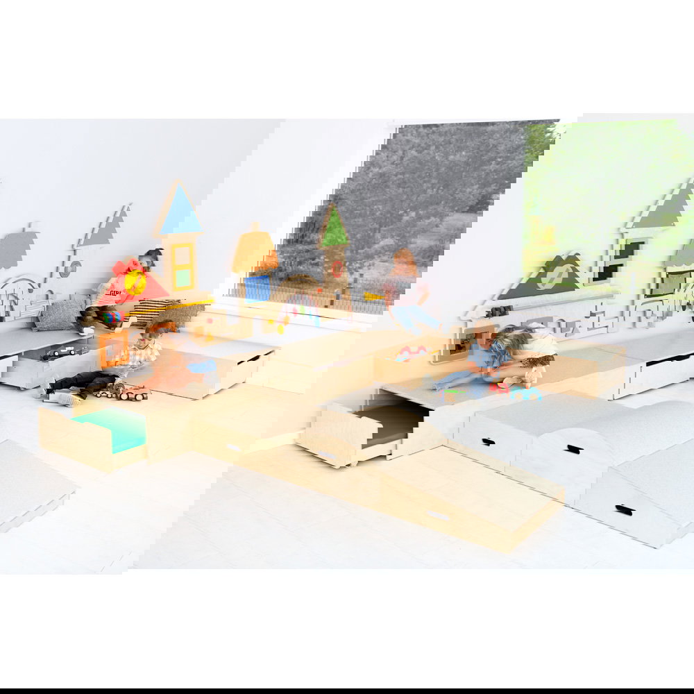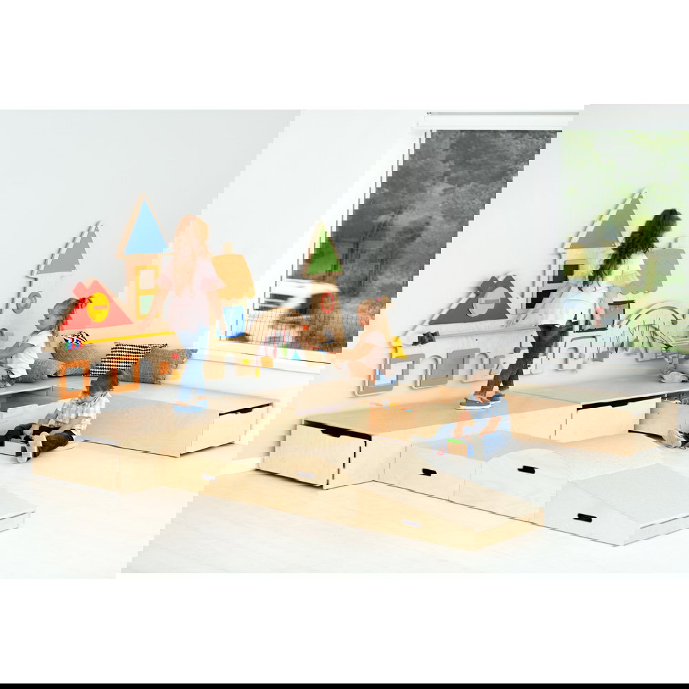 Bringen Sie Komfort und Flexibilität in Ihre Kita mit unserem multifunktionalen Podest mit Auszugsbett – ideal zum Spielen und Schlafen!