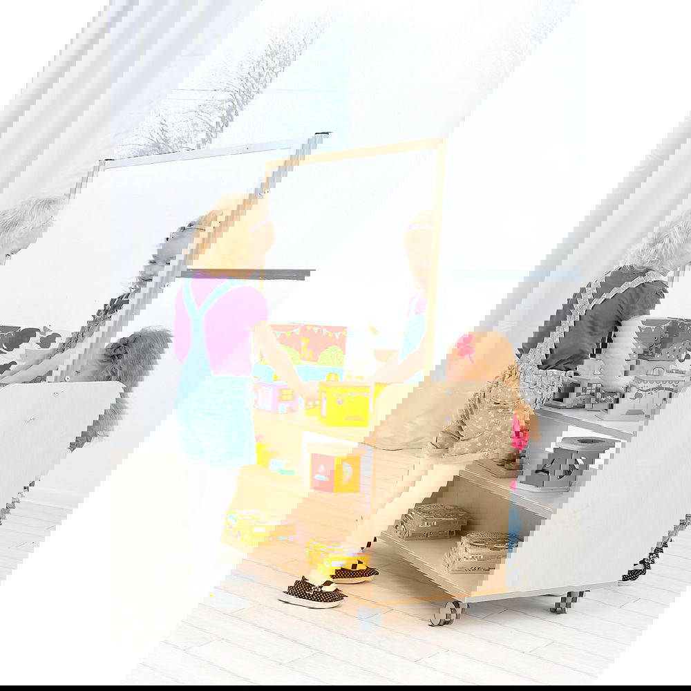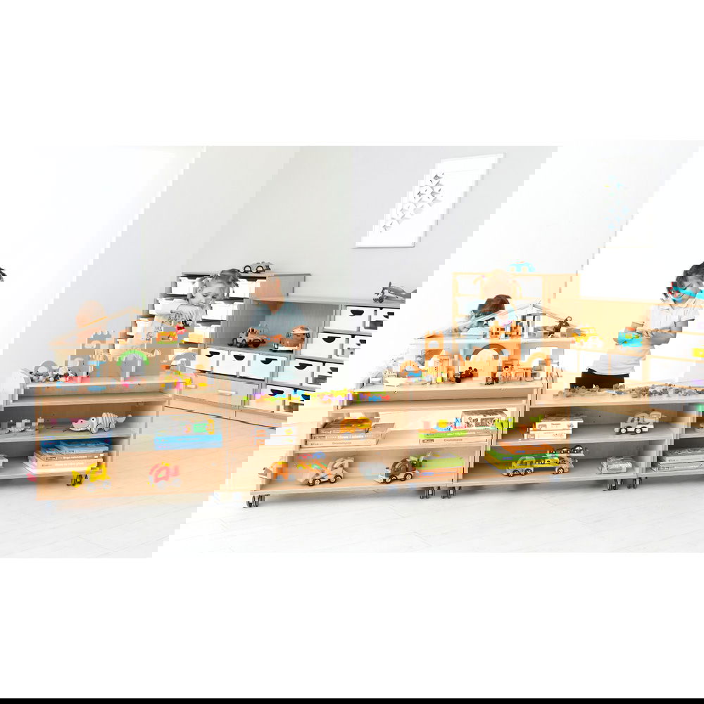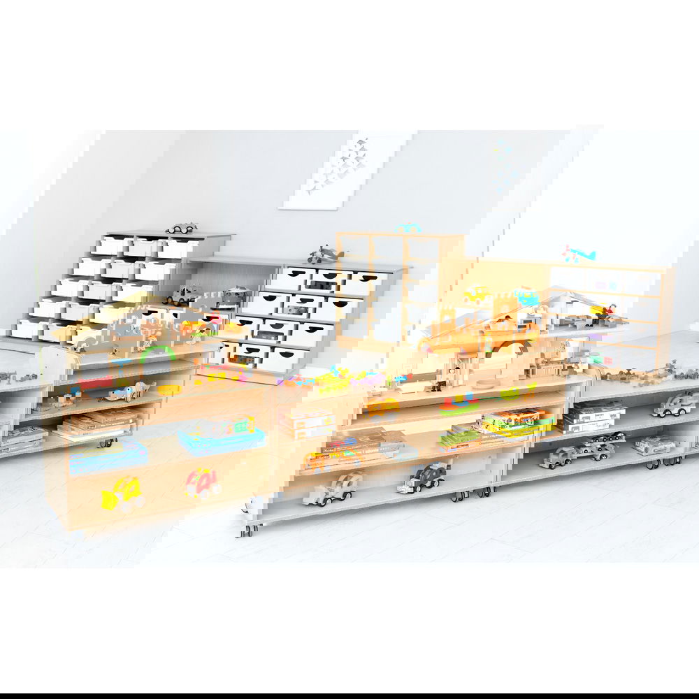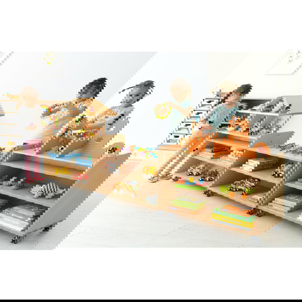 Im Gegensatz zu offenen Regalen bietet dieses Modell durch seine stabile Rückwand einen entscheidenden Vorteil: Es sorgt dafür, dass Materialien sicher an ihrem Platz bleiben und schafft optische Ruhe. Stellen Sie es als Raumteiler auf, um eine gemütliche Leseecke vom lebhaften Spielbereich abzugrenzen, oder nutzen Sie es als mobile Materialstation, die Sie direkt an den Arbeitstisch rollen können. Mit einer Höhe von 61,4 cm ist es ideal auf die Ergonomie von Kindern abgestimmt und dient gleichzeitig als perfekte Basis für zahlreiche spannende Aufsatzelemente der Flexi-Serie, vom Kaufladen bis zur Werkbank.