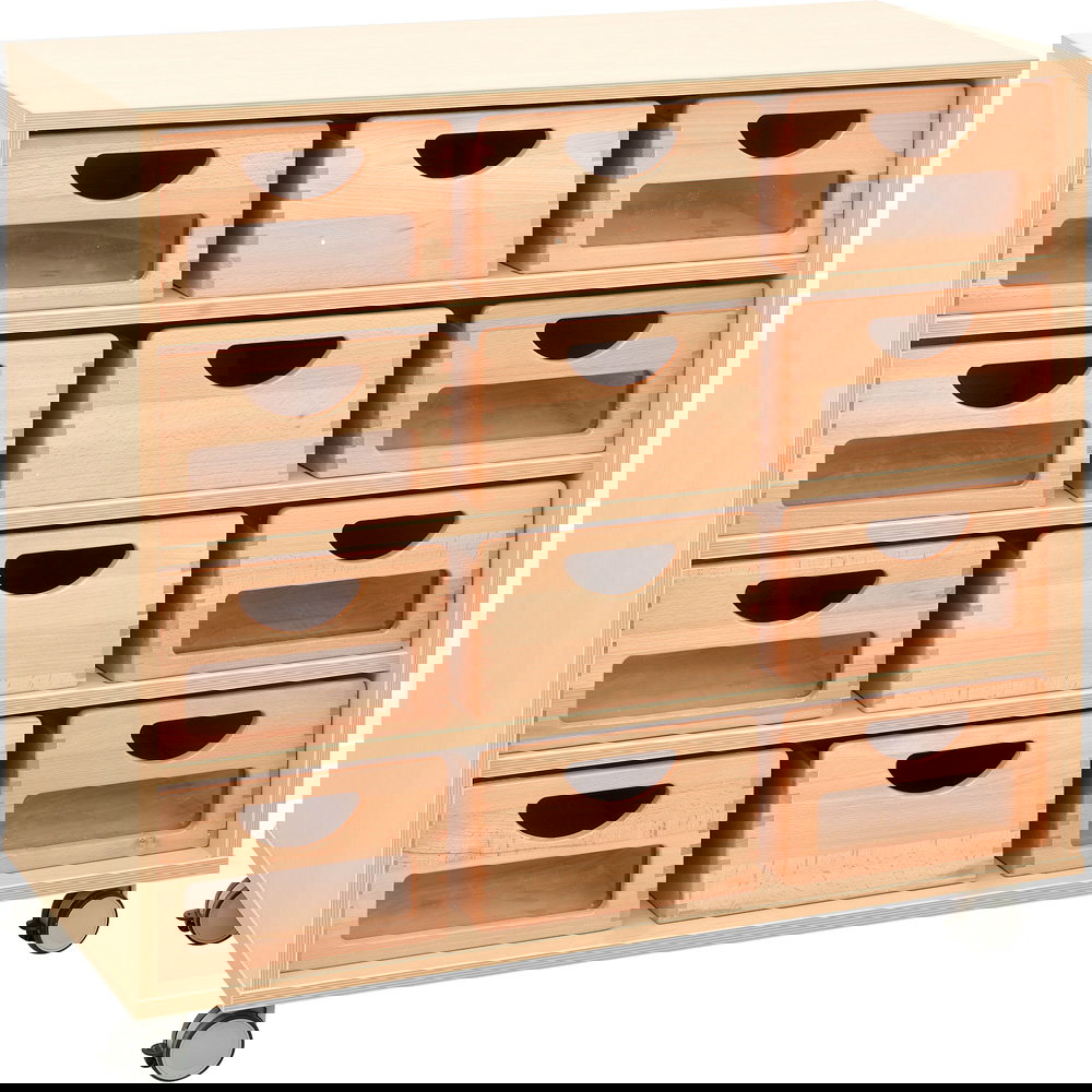 Dieses Set kombiniert den bewährten, mittelhohen Flexi-Korpus mit der Freiheit von vier robusten Rollen und einem umfangreichen Satz an Ordnungshüfern. Im Lieferumfang sind zwölf passgenaue Holzbehälter enthalten: Acht davon verfügen über ein praktisches Sichtfenster, vier sind klassisch geschlossen. Diese durchdachte Mischung ermöglicht es Erziehern und Kindern, ein intuitives Ordnungssystem zu etablieren. Materialien, die inspirieren sollen, bleiben sichtbar, während kleinteiliges Zubehör ruhig und unsichtbar verstaut wird. Das harmonische Zusammenspiel von hellem Birke-Dekor und naturbelassenem Buchenholz der Kästen schafft dabei eine warme, förderliche Atmosphäre.