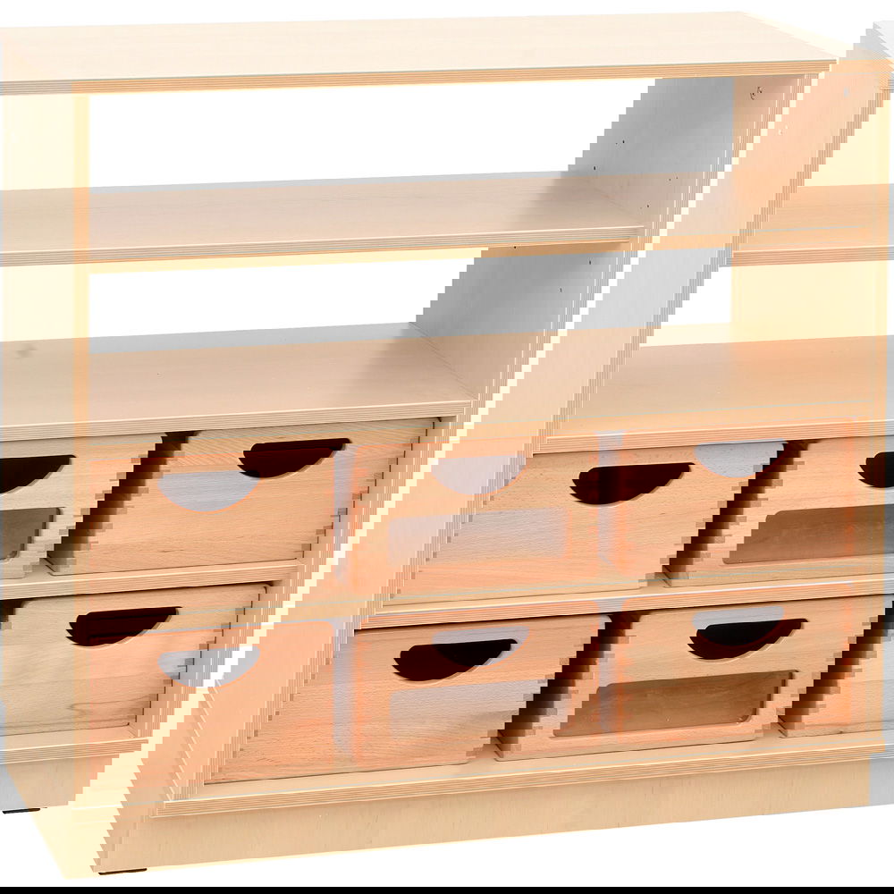 Dank der fehlenden Rückwand wirkt der Schrank transparent und leicht. Er eignet sich hervorragend, um Spielbereiche oder Lernecken abzugrenzen. Da er von beiden Seiten zugänglich ist, fördert er die Interaktion und ermöglicht flexible Raumnutzungskonzepte. - Maximale Stabilität und Sicherheit