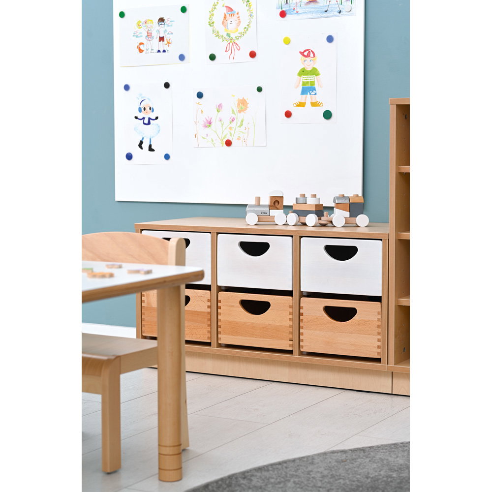 Die vertikalen Trennwände unterteilen den Schrank in drei klar definierte Bereiche. Dies ist die perfekte Vorbereitung, um bis zu sechs Holzbehälter aufzunehmen und Spielmaterialien systematisch zu sortieren. So lernt jedes Kind, wo die Dinge hingehören. - Fester Stand und klare Optik
