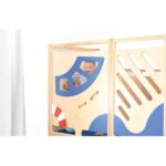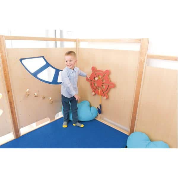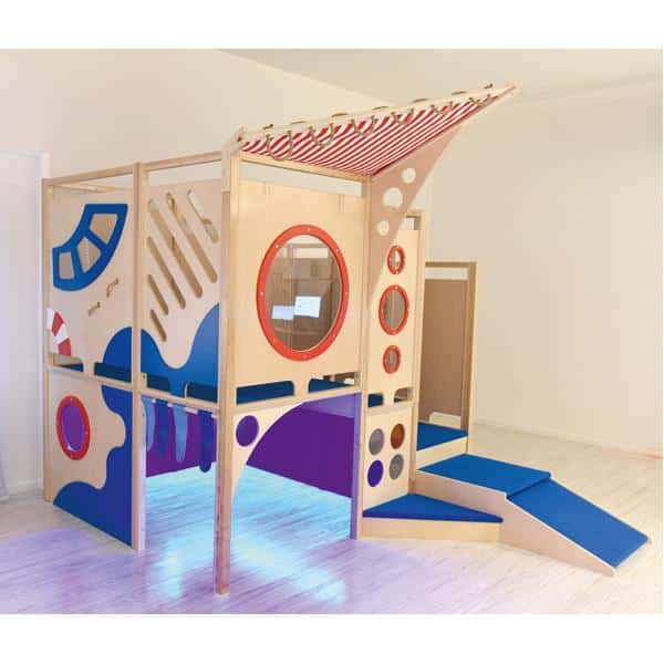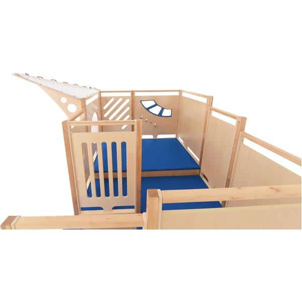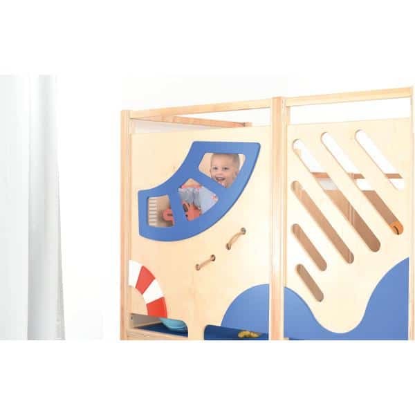 Die Spielburg Neptun überzeugt durch ihre stabile Bauweise und hochwertigen Materialien. Die Grundkonstruktion besteht aus robustem Sperrholz und einem Massivholzgestell, ergänzt durch farbige MDF-Platten und laminierte Spanplatten. Der Podestbelag aus tretford-Teppichboden sorgt für Langlebigkeit und Komfort. Die Bullaugen aus Plexiglas mit einem Durchmesser von 60 cm bieten den Kindern spannende Ausblicke und wecken ihre Neugier.