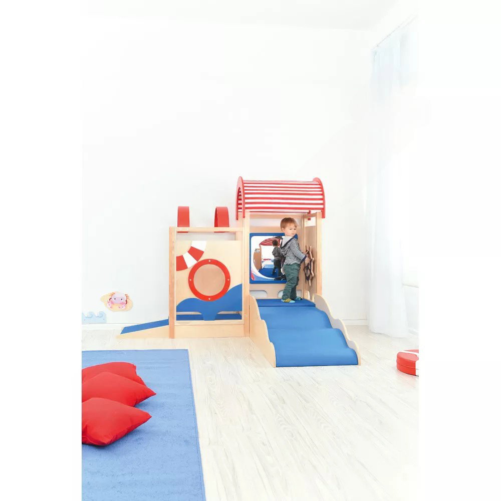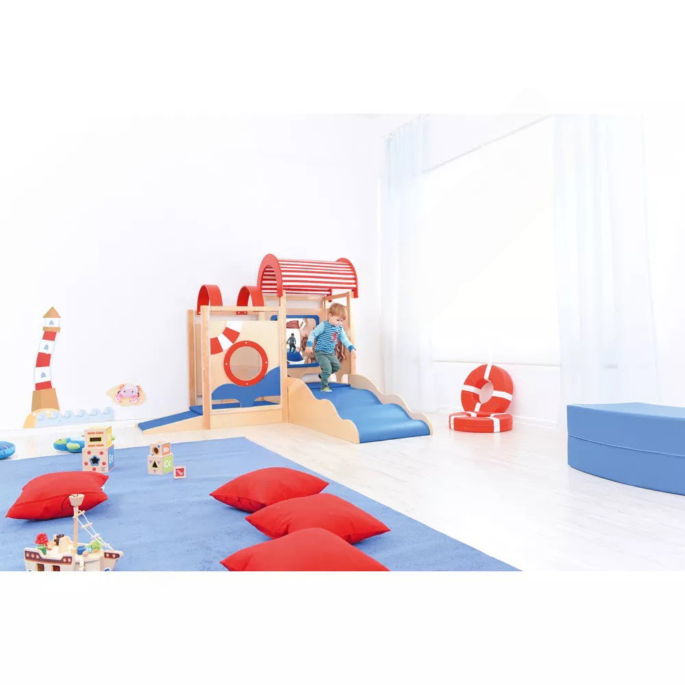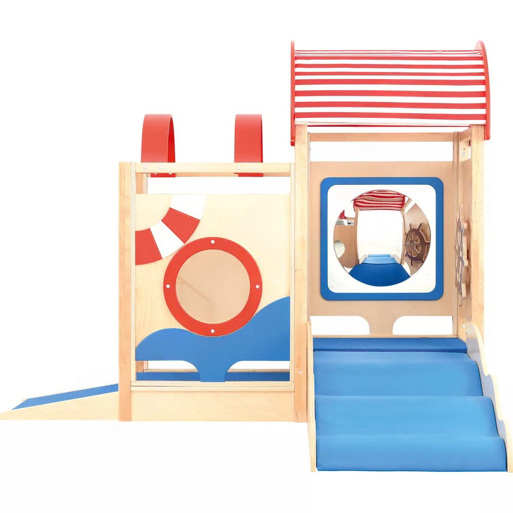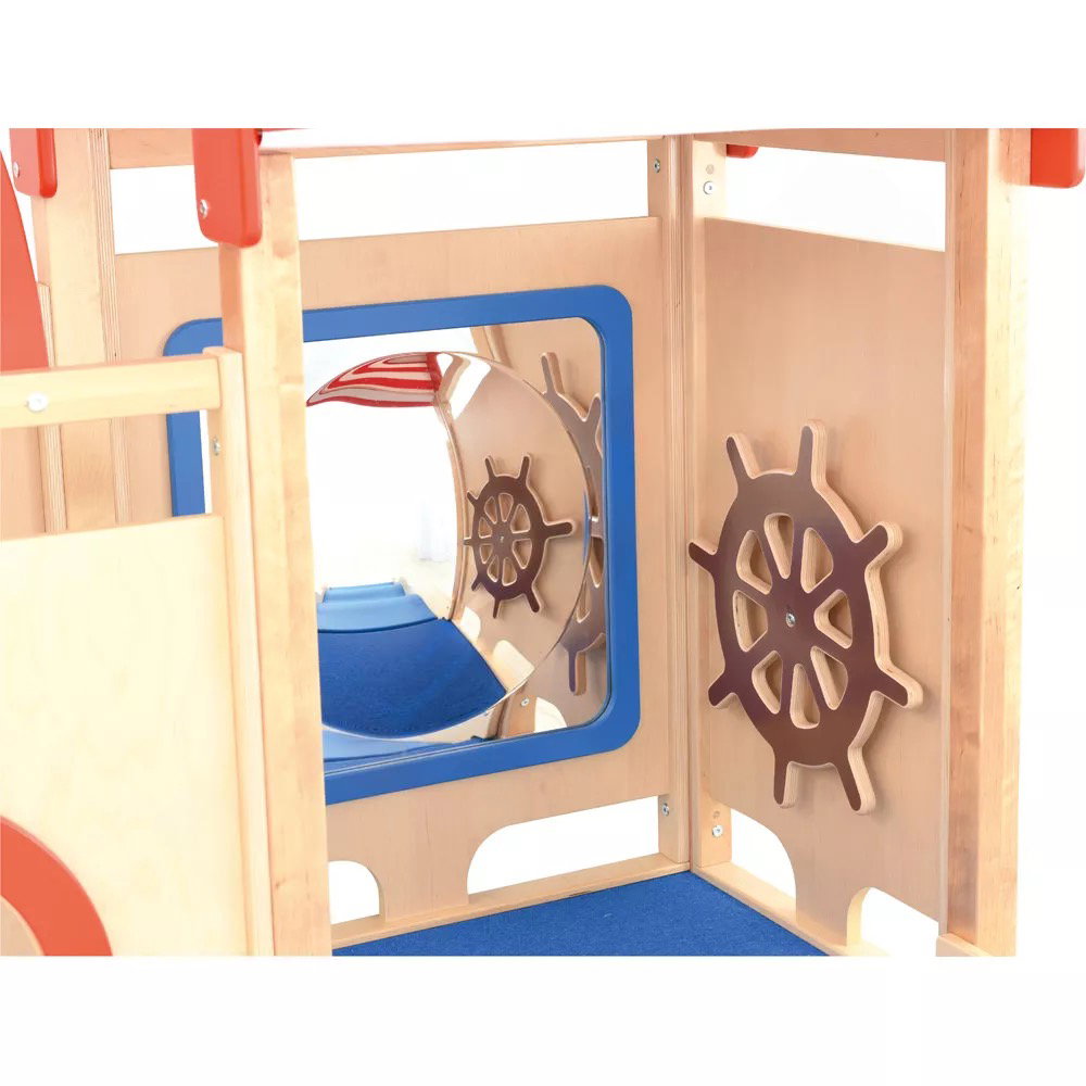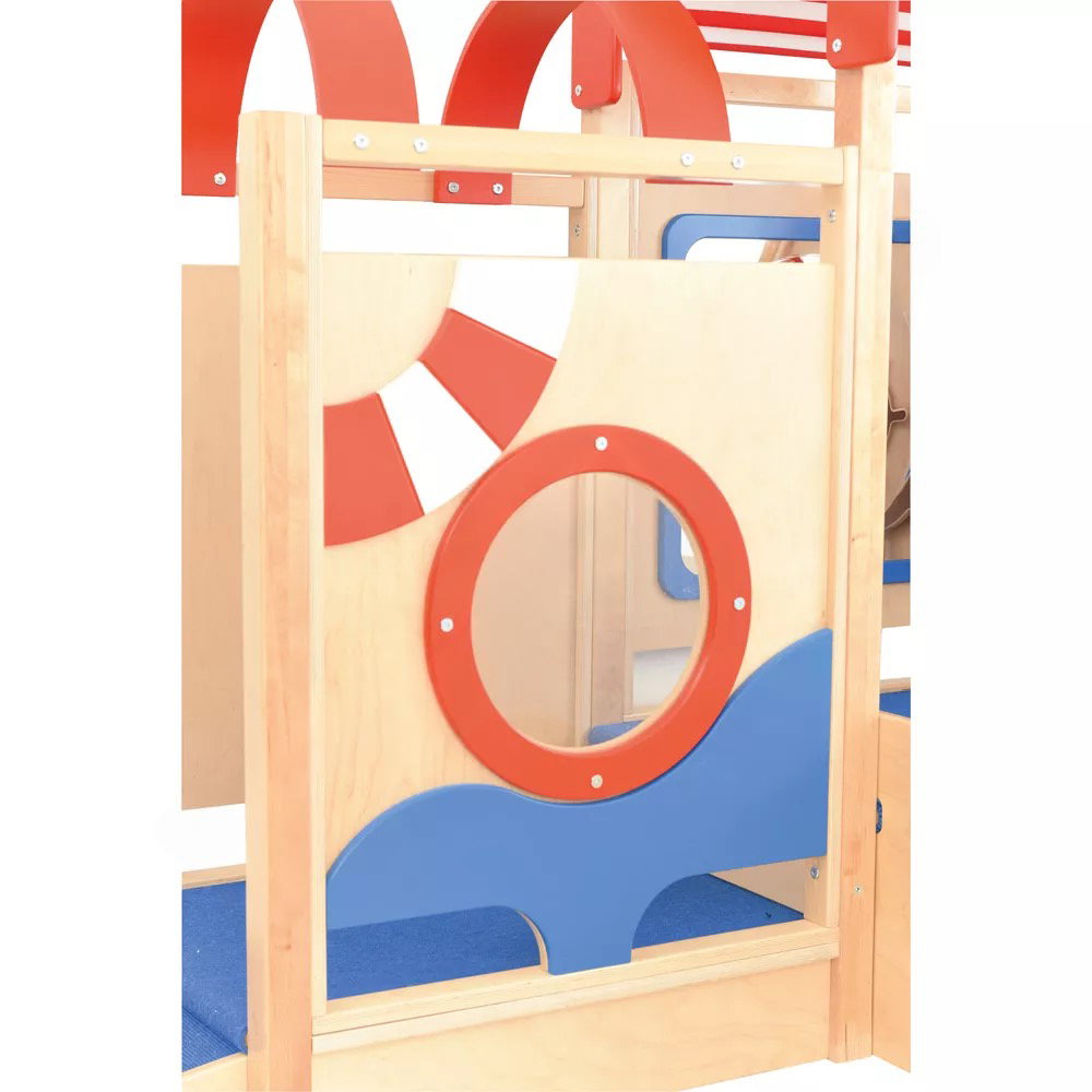 Die integrierten sensorischen Elemente wecken die Neugier und laden zum Forschen ein. Der Zerrspiegel bietet visuelle Reize und fördert das Erkennen des eigenen Spiegelbilds in veränderter Form. Das drehbare Steuerrad und das Bullauge aus Acrylglas regen zu ersten Rollenspielen an und schulen die Feinmotorik sowie die Auge-Hand-Koordination.