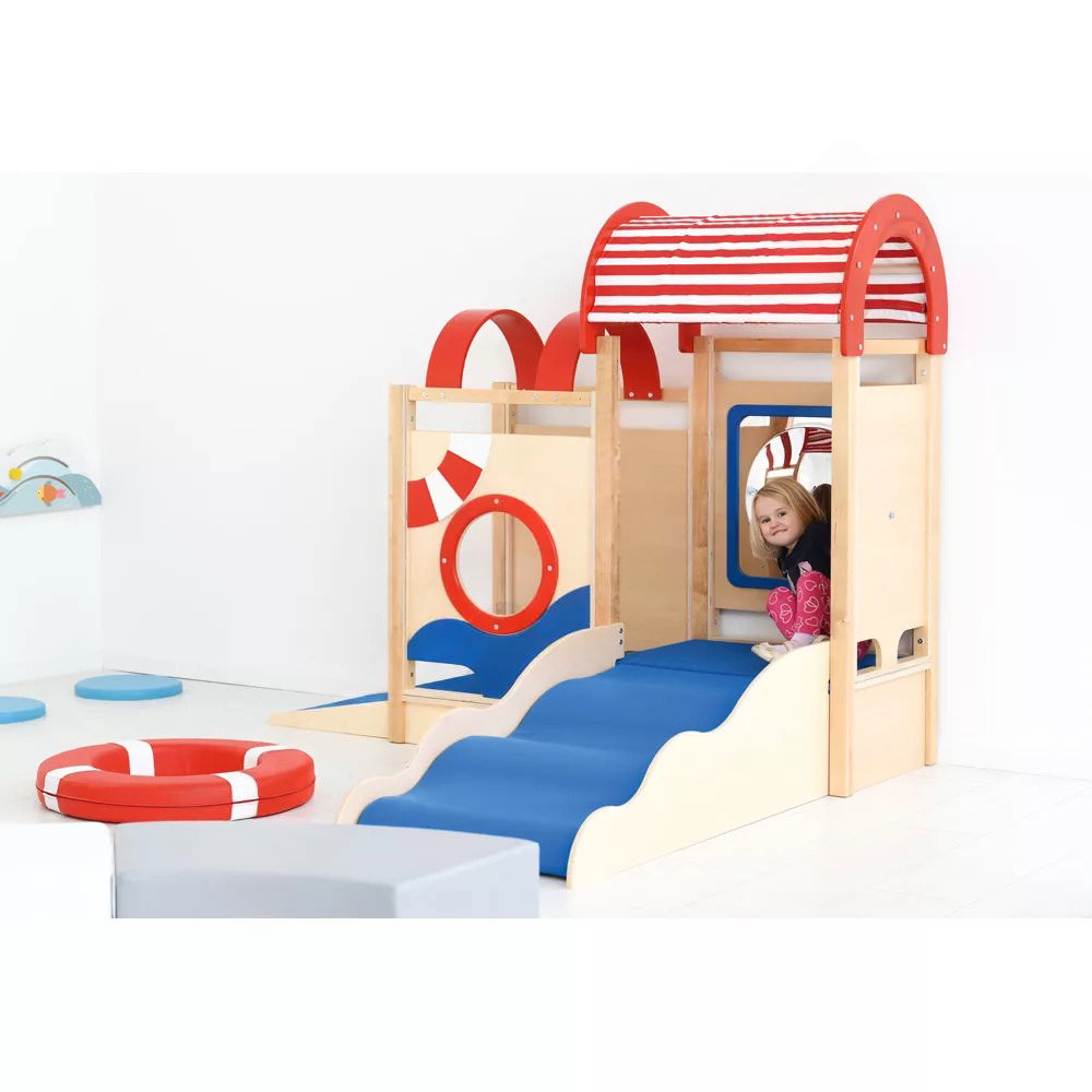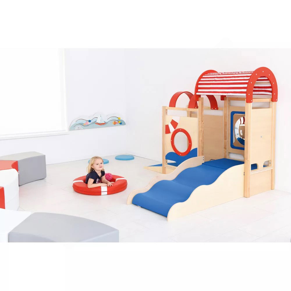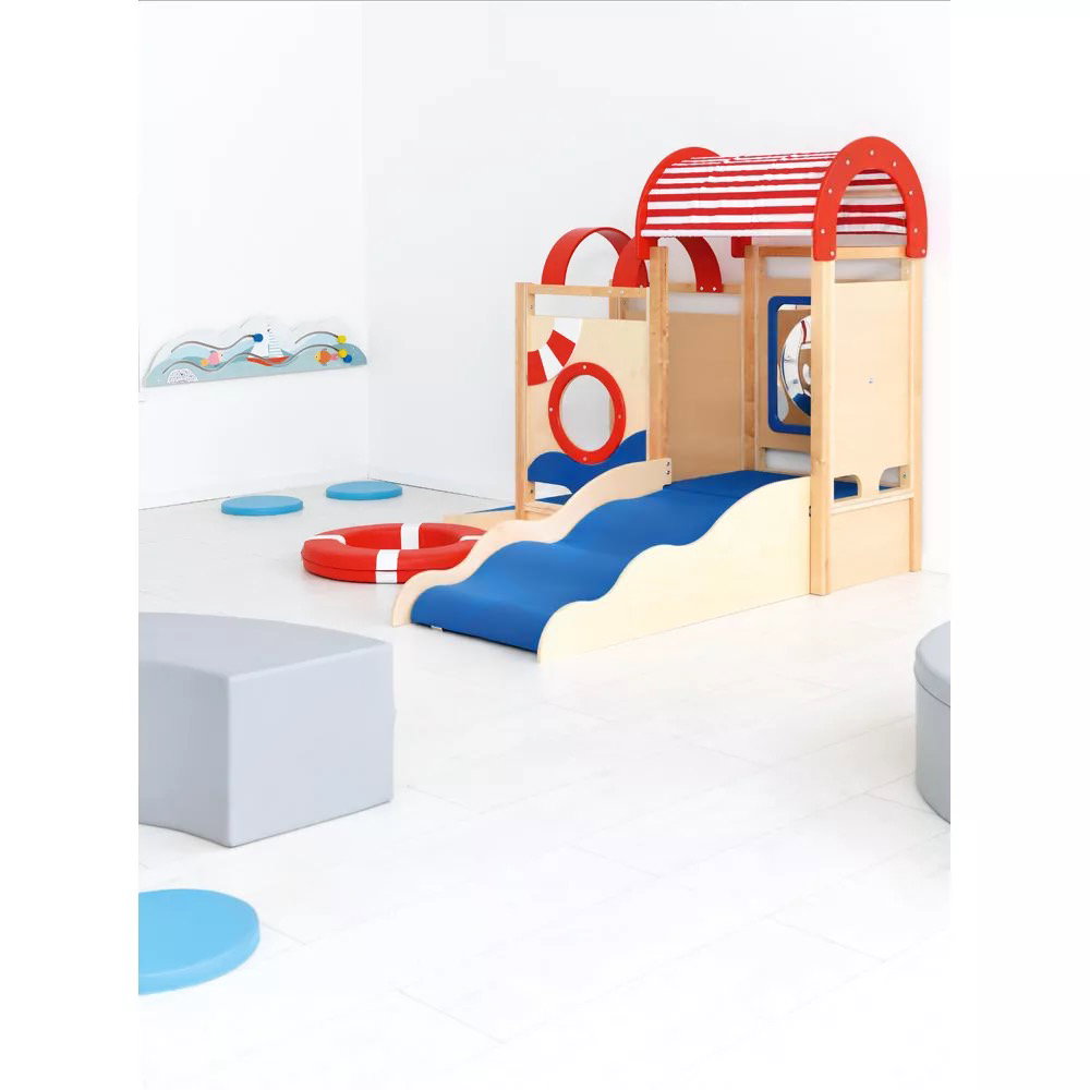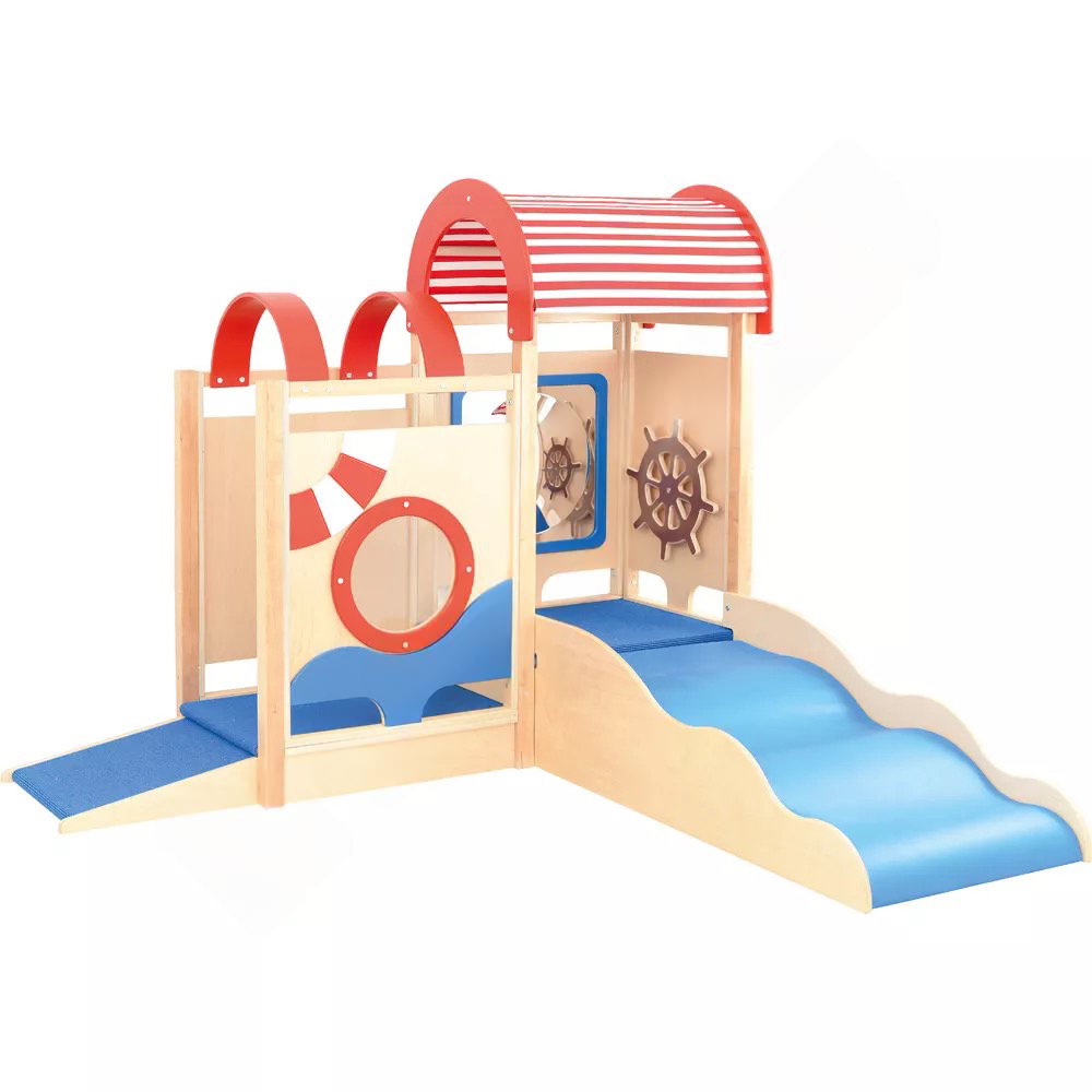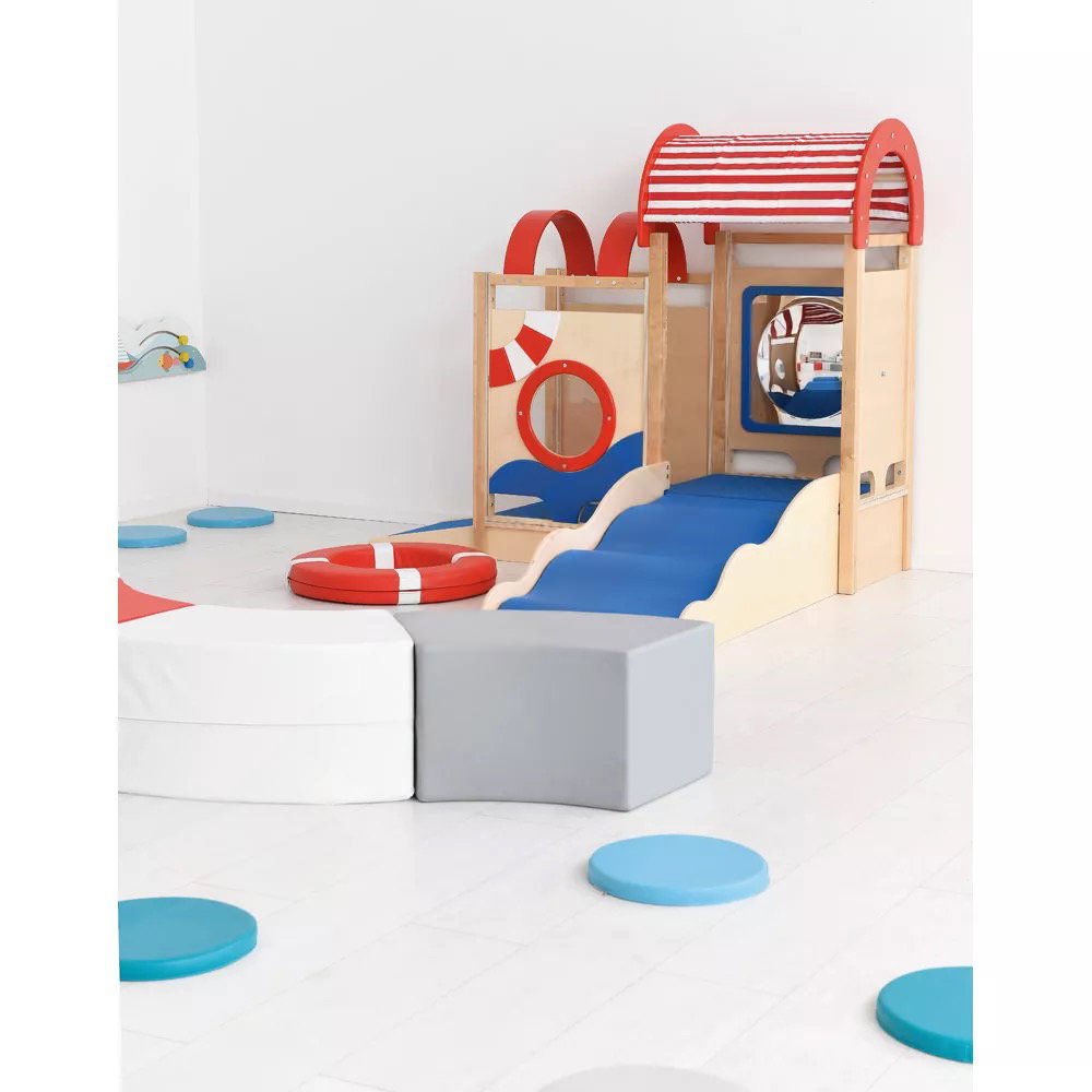 Die integrierten sensorischen Elemente wecken die Neugier und laden zum Forschen ein. Der Zerrspiegel bietet visuelle Reize und fördert das Erkennen des eigenen Spiegelbilds in veränderter Form. Das drehbare Steuerrad und das Bullauge aus Acrylglas regen zu ersten Rollenspielen an und schulen die Feinmotorik sowie die Auge-Hand-Koordination.