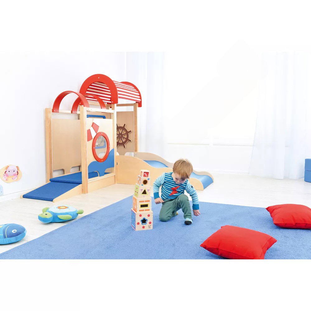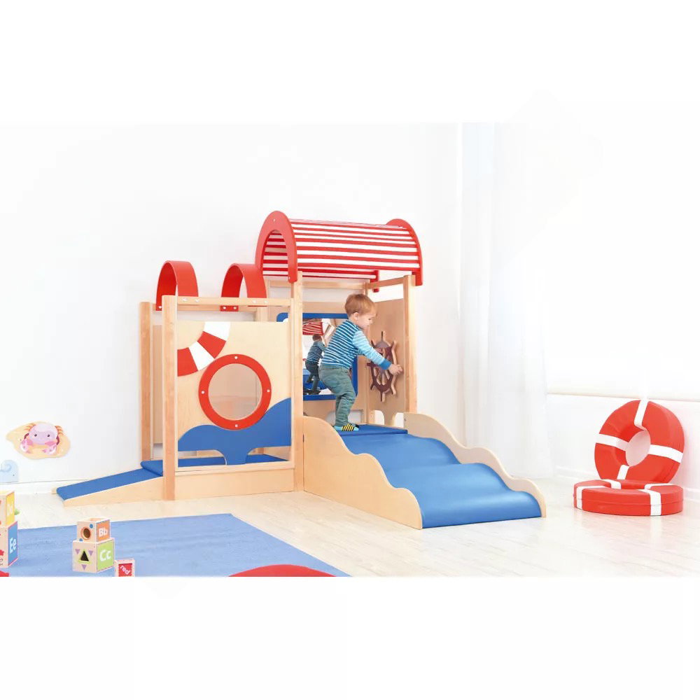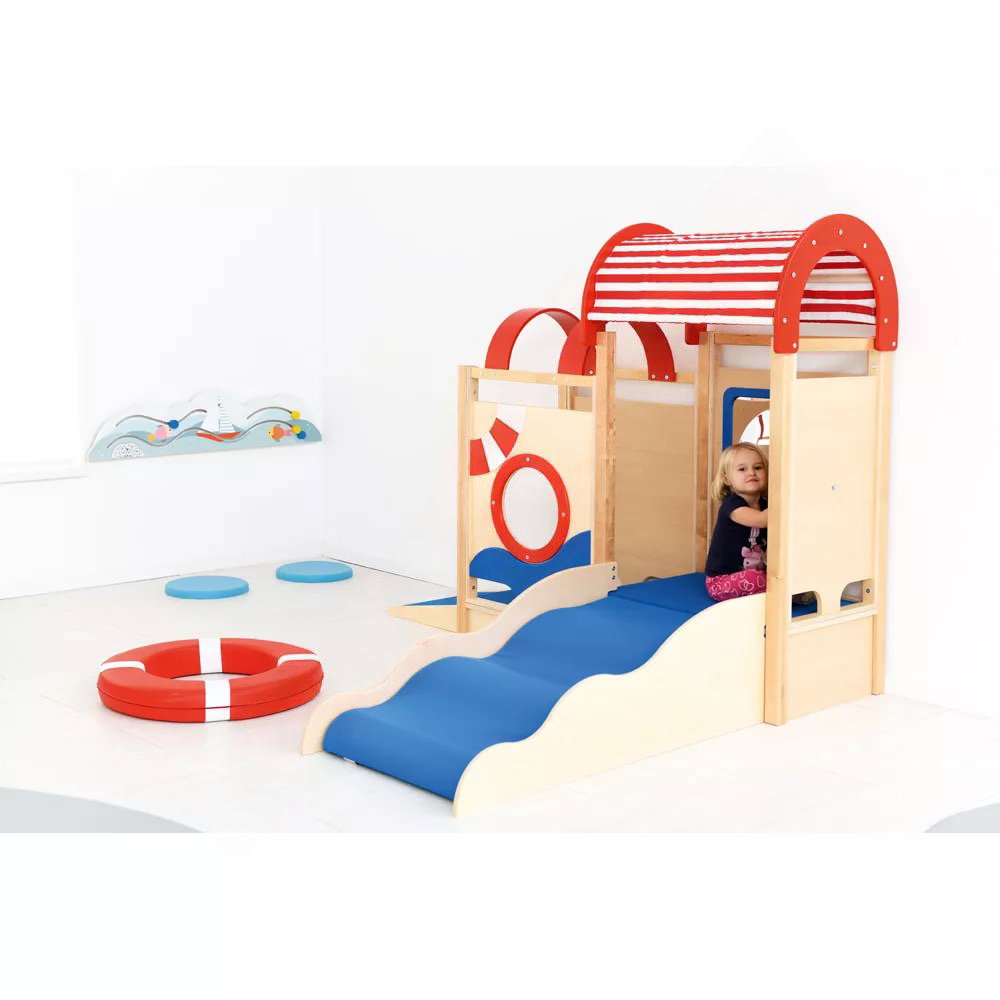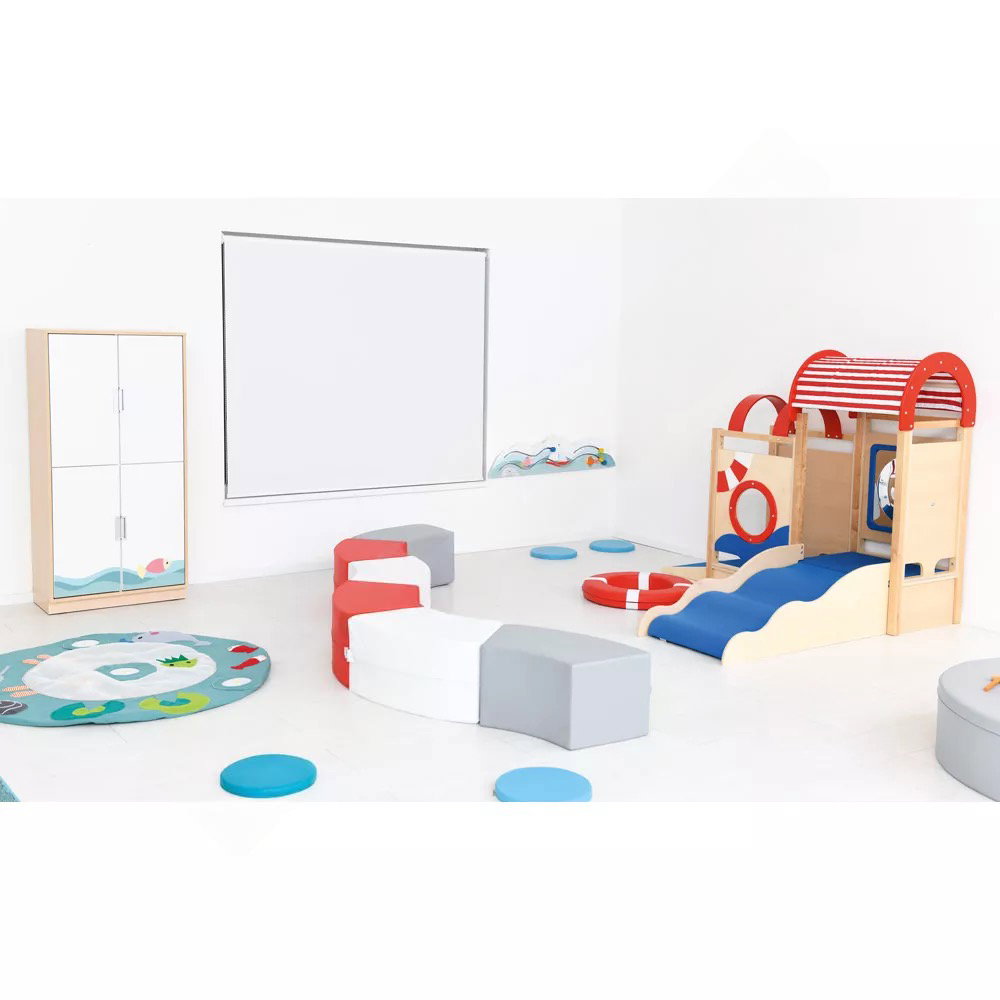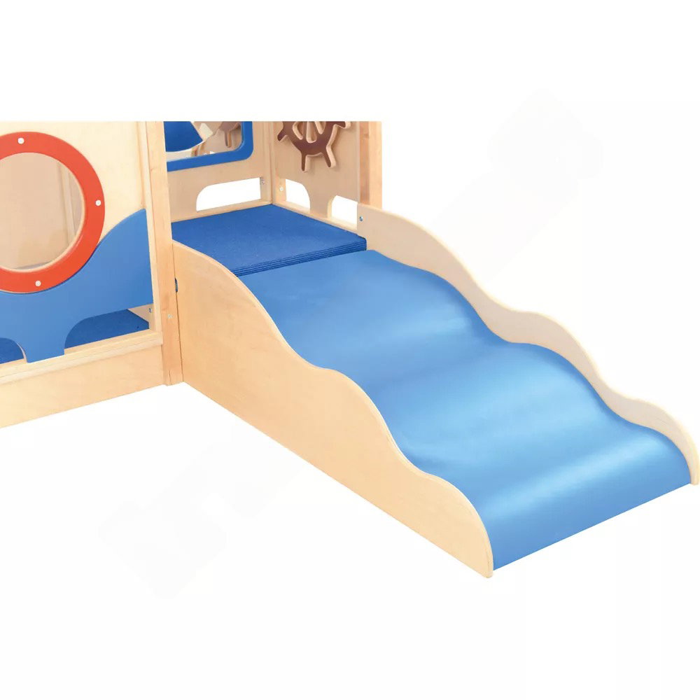 Die integrierten sensorischen Elemente wecken die Neugier und laden zum Forschen ein. Der Zerrspiegel bietet visuelle Reize und fördert das Erkennen des eigenen Spiegelbilds in veränderter Form. Das drehbare Steuerrad und das Bullauge aus Acrylglas regen zu ersten Rollenspielen an und schulen die Feinmotorik sowie die Auge-Hand-Koordination.
