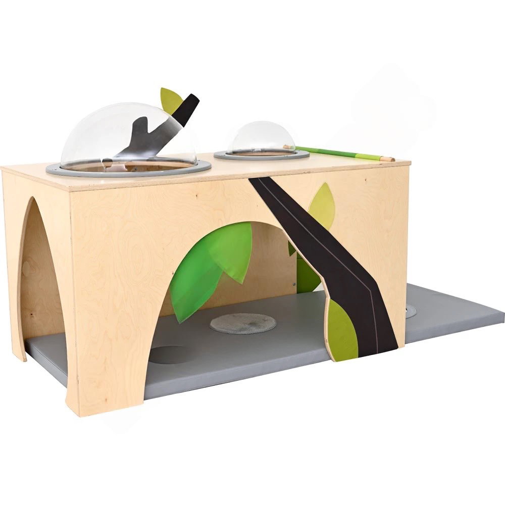 Diese liebevoll gestaltete Spiellandschaft ist weit mehr als ein einfaches Möbelstück. Sie ist ein pädagogisches Werkzeug, das Kinder dazu einlädt, ihre Sinne zu schärfen. Durch den weichen Blätter-Vorhang zu krabbeln, die versteckten Glöckchen zu hören oder durch die Bullaugen in den Himmel (oder zur Decke) zu schauen – all das sind kleine Abenteuer, die die Entwicklung spielerisch fördern. Die rechts angebrachte Spielmatte erweitert den geschützten Bereich und bietet zusätzlichen Platz zum Liegen, Rollen und Erforschen der verschiedenen Oberflächenstrukturen. Ob als Höhle, Versteck oder Beobachtungsposten – der Flora Unterschlupf wird schnell zum Herzstück im Gruppenraum.
