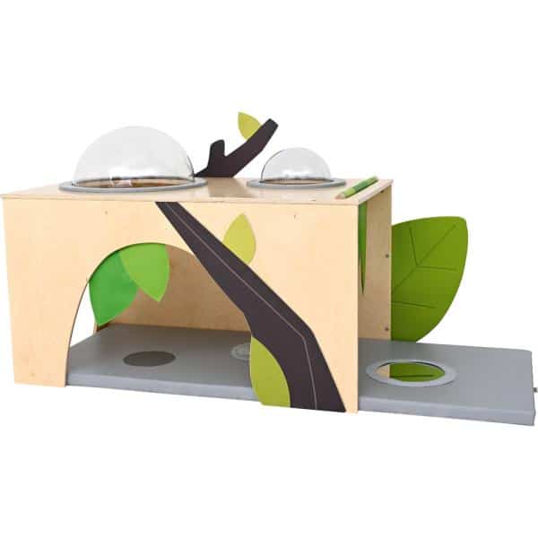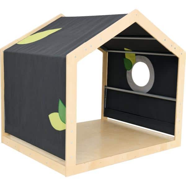 Eine Spielecke in Form eines Hauses, aus lackiertem Sperrholz. Baldachin aus Stoff mit Blattmotiv und 1 Fenster in Wandhöhe. Im Inneren können Kissen oder Sitze platziert werden.