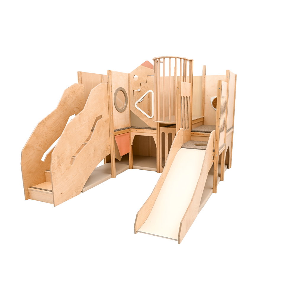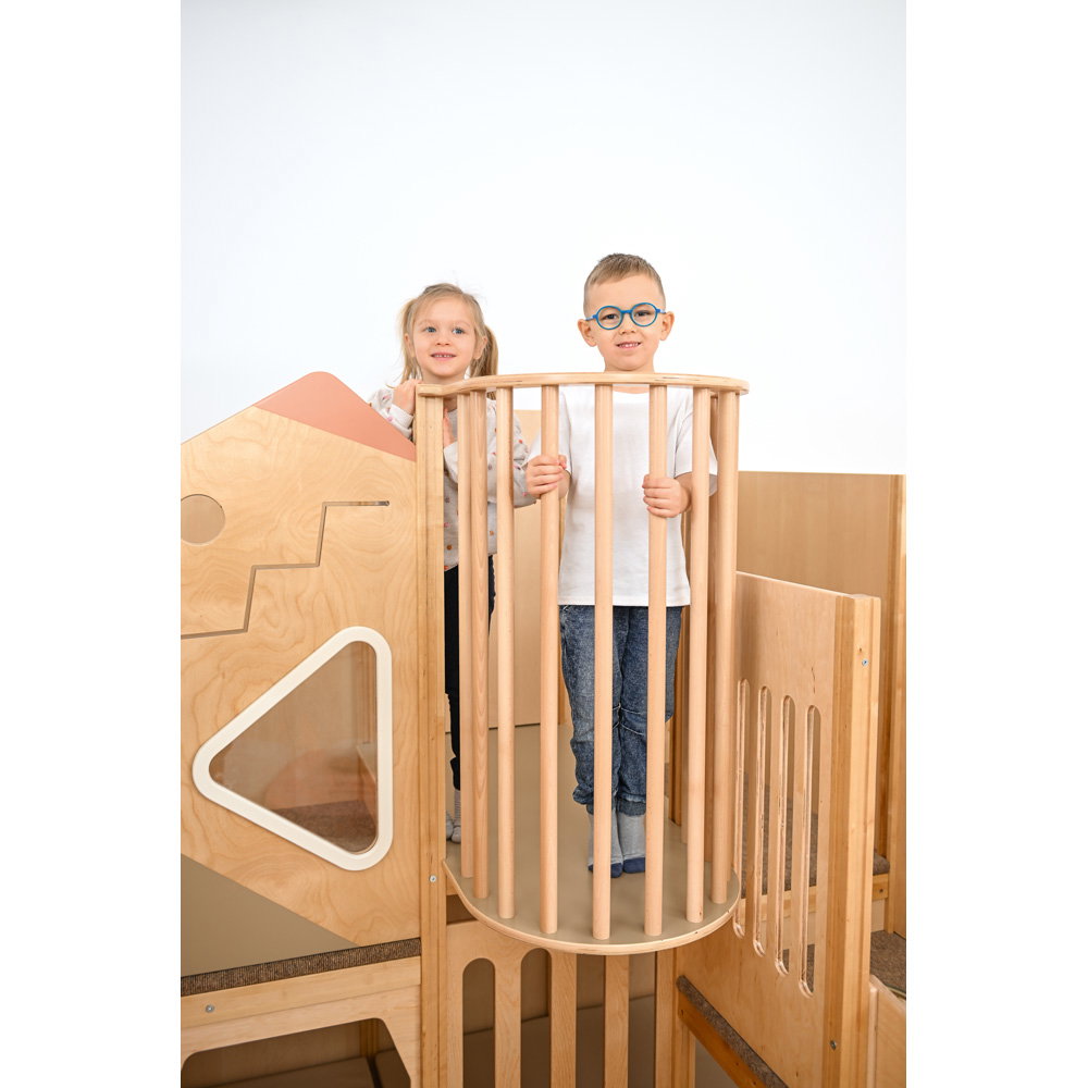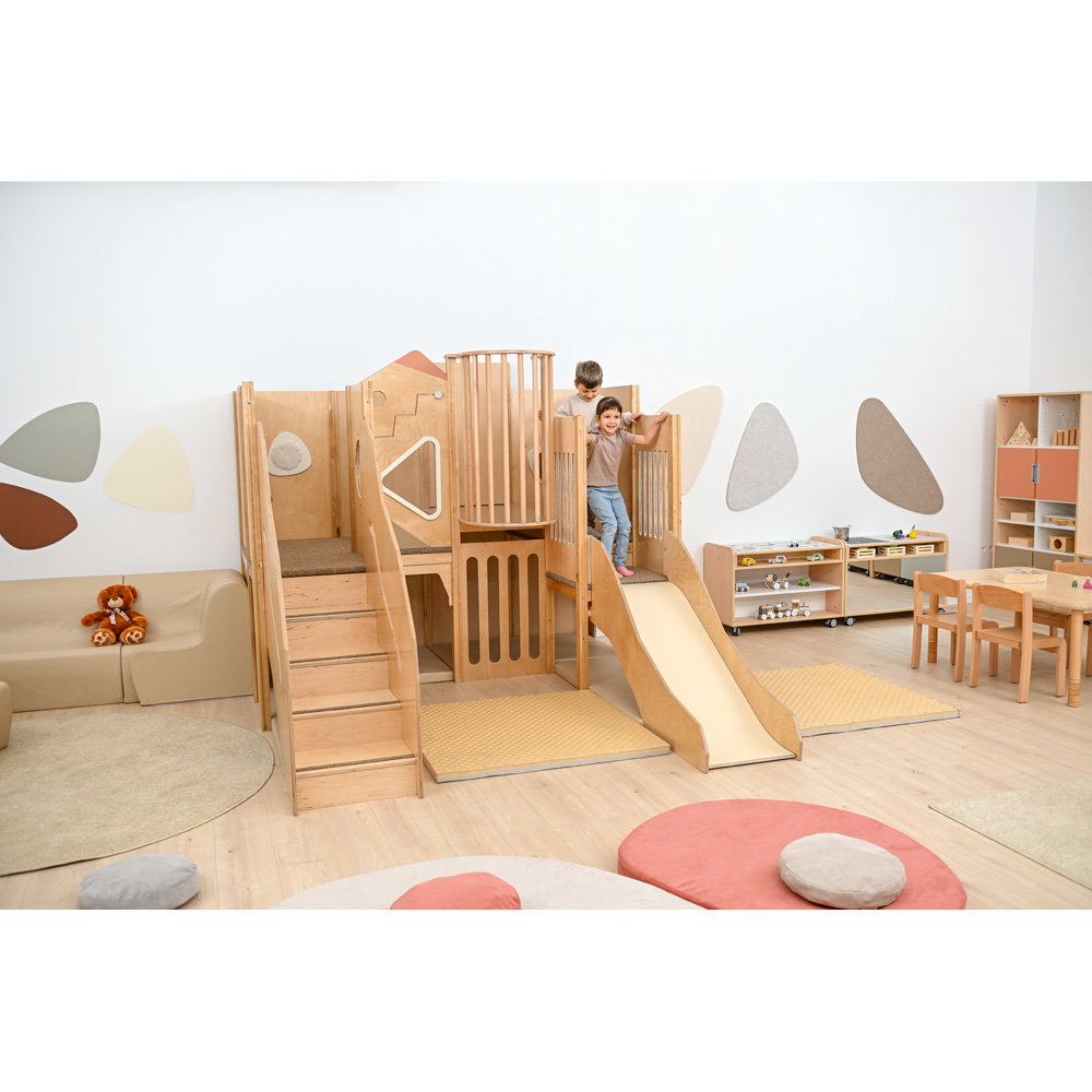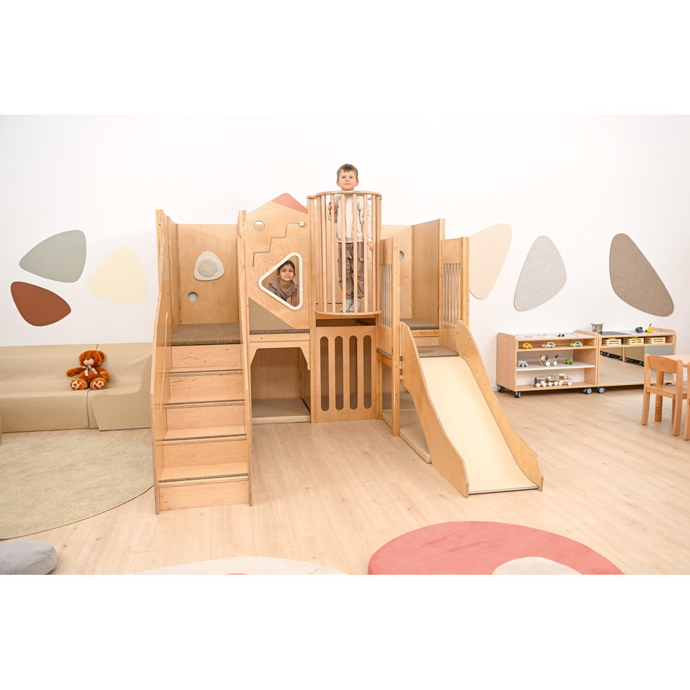 Hier wird geklettert, gerutscht und balanciert! Die unterschiedlichen Podesthöhen (59, 78 und 94 cm) schaffen spannende Bewegungsanreize, die Grobmotorik und Gleichgewichtssinn trainieren. Zusätzlich schulen drei fest installierte Motoriktafeln die Feinmotorik und Konzentration der Kinder auf spielerische Weise.