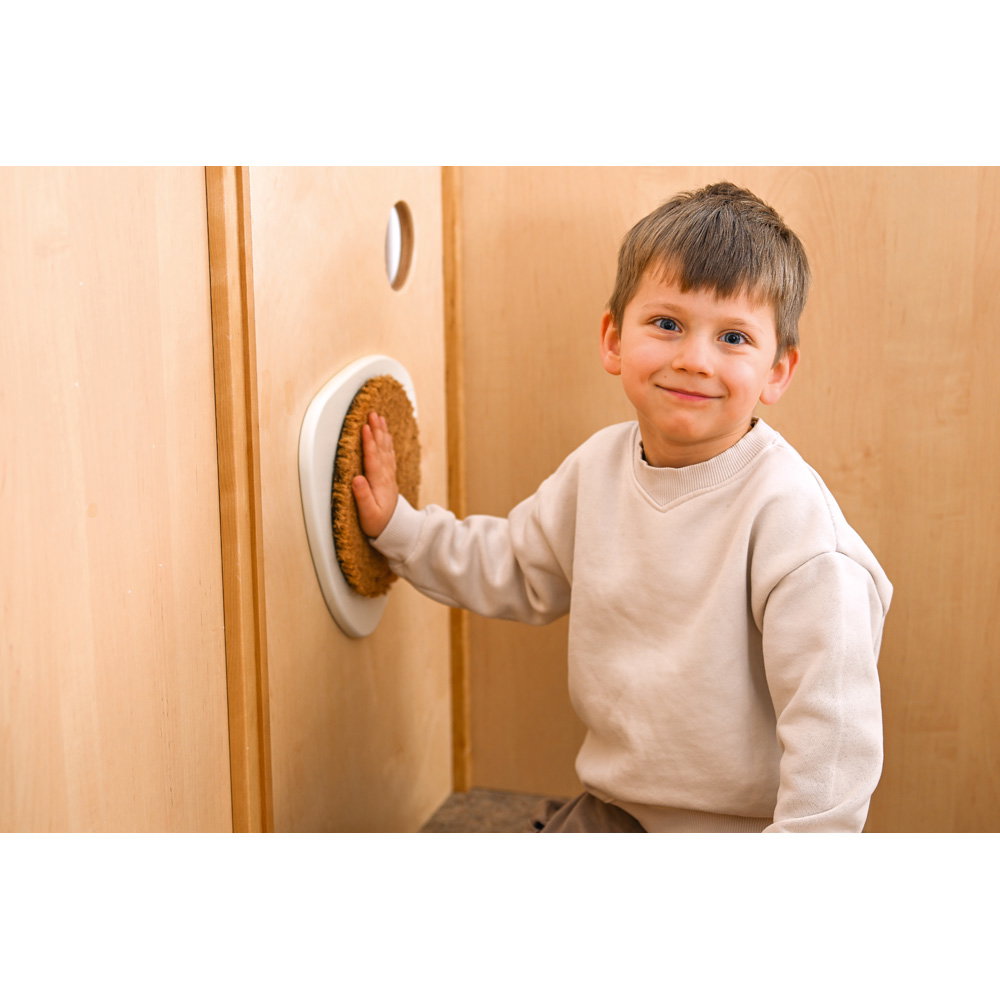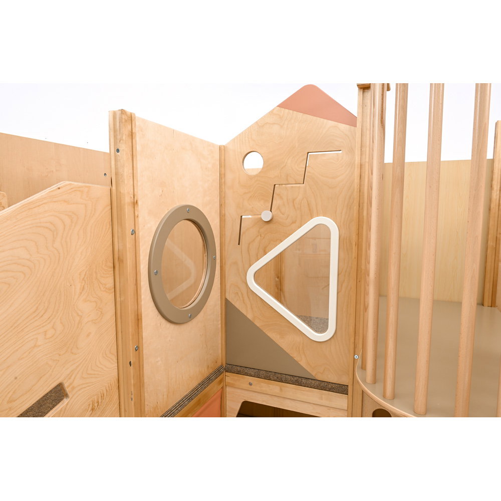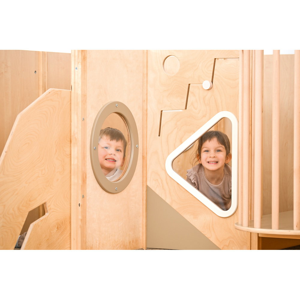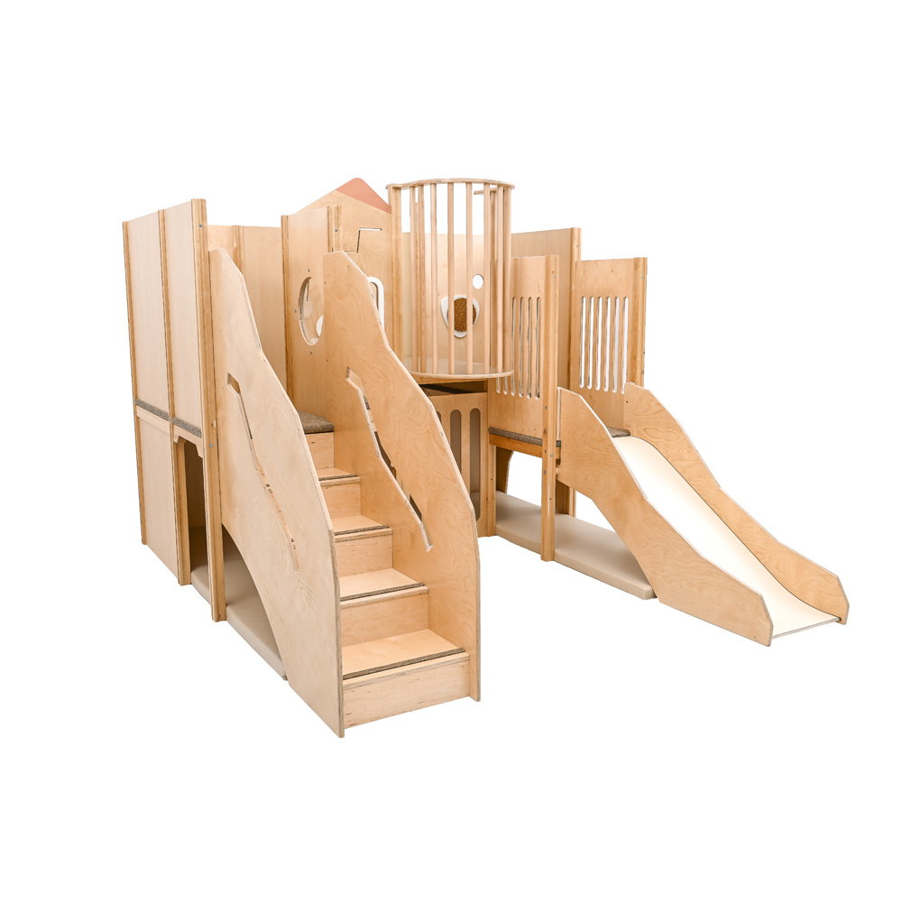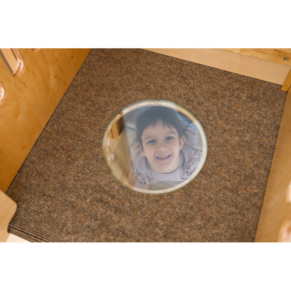 Hier wird geklettert, gerutscht und balanciert! Die unterschiedlichen Podesthöhen (59, 78 und 94 cm) schaffen spannende Bewegungsanreize, die Grobmotorik und Gleichgewichtssinn trainieren. Zusätzlich schulen drei fest installierte Motoriktafeln die Feinmotorik und Konzentration der Kinder auf spielerische Weise.