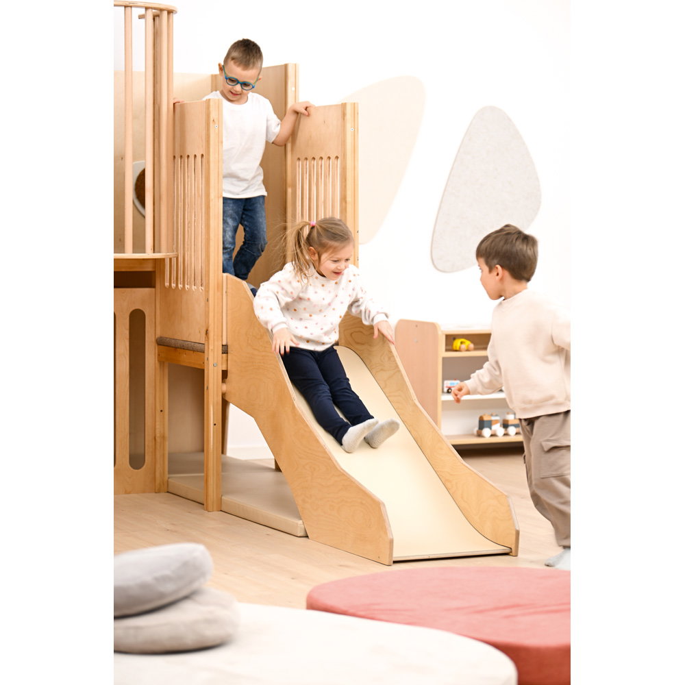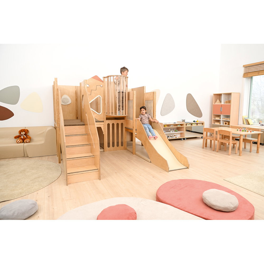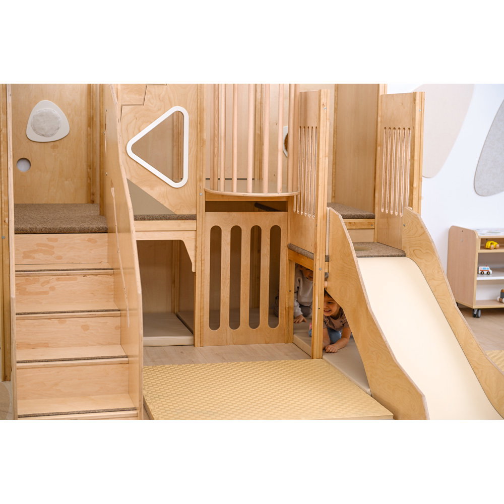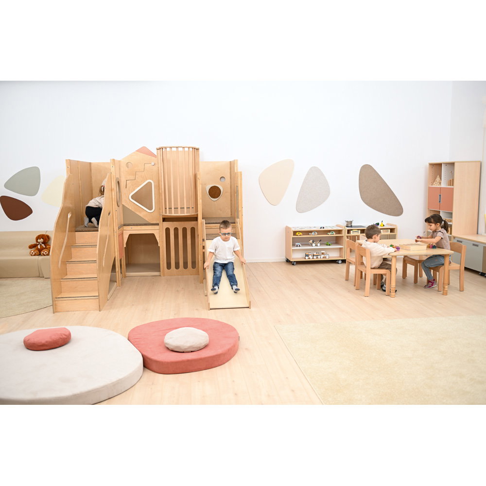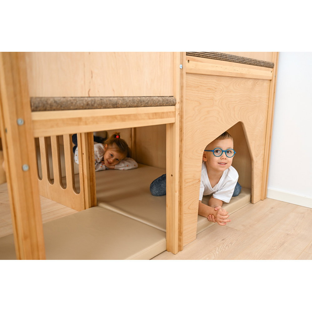 Über eine sichere Treppe erklimmen die kleinen Entdecker verschiedene Ebenen, balancieren über den „Balkon“ und sausen schließlich die robuste Rutsche hinab. Doch nicht nur Bewegung steht im Fokus: Drei integrierte Motoriktafeln an den Wänden fordern die Geschicklichkeit heraus, während gemütliche Ruhezonen mit weichen Matratzen zum Verweilen und Träumen einladen. Die Kombination aus aktivem Toben, kognitiver Förderung und entspanntem Rückzug macht diese Spielecke zum vielseitigen Mittelpunkt des Gruppenraums.