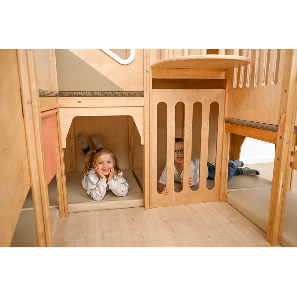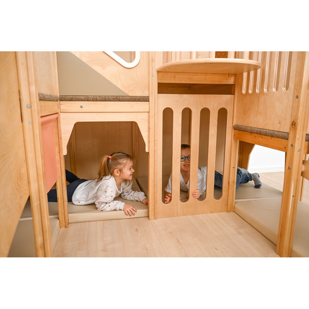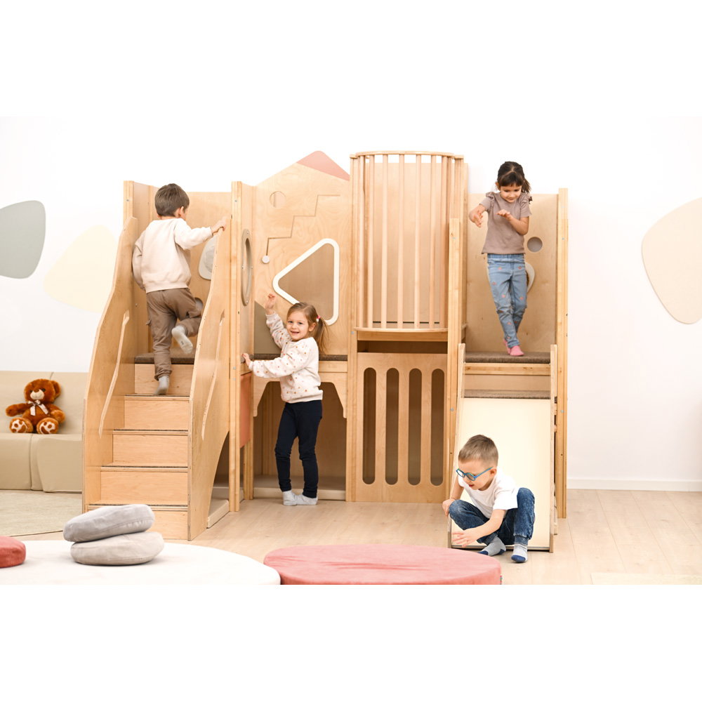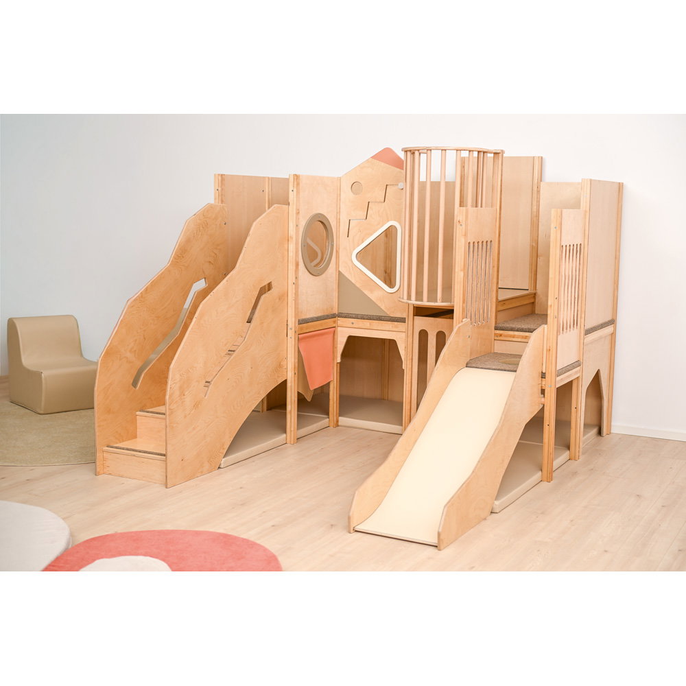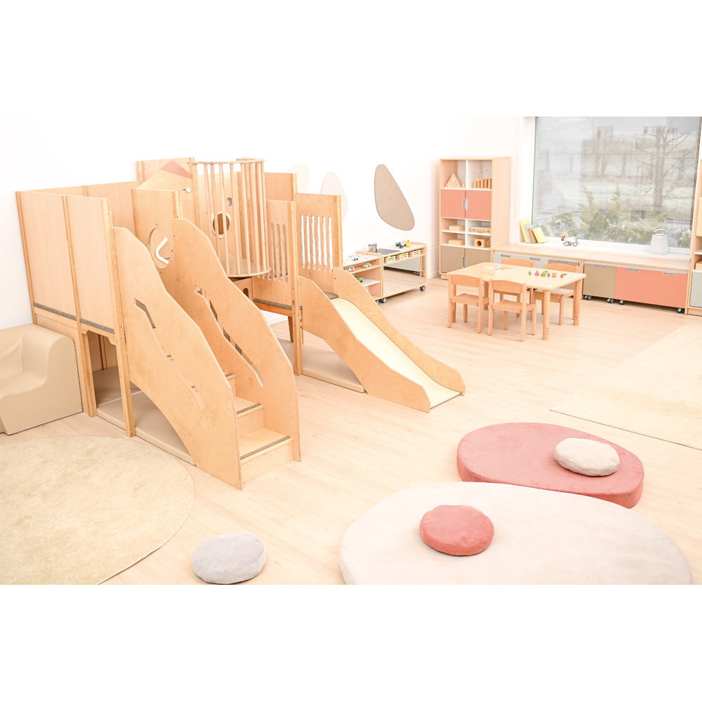 Über eine sichere Treppe erklimmen die kleinen Entdecker verschiedene Ebenen, balancieren über den „Balkon“ und sausen schließlich die robuste Rutsche hinab. Doch nicht nur Bewegung steht im Fokus: Drei integrierte Motoriktafeln an den Wänden fordern die Geschicklichkeit heraus, während gemütliche Ruhezonen mit weichen Matratzen zum Verweilen und Träumen einladen. Die Kombination aus aktivem Toben, kognitiver Förderung und entspanntem Rückzug macht diese Spielecke zum vielseitigen Mittelpunkt des Gruppenraums.