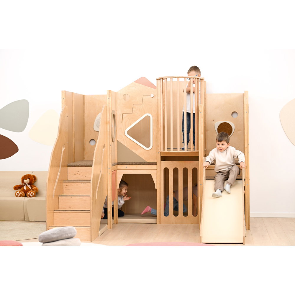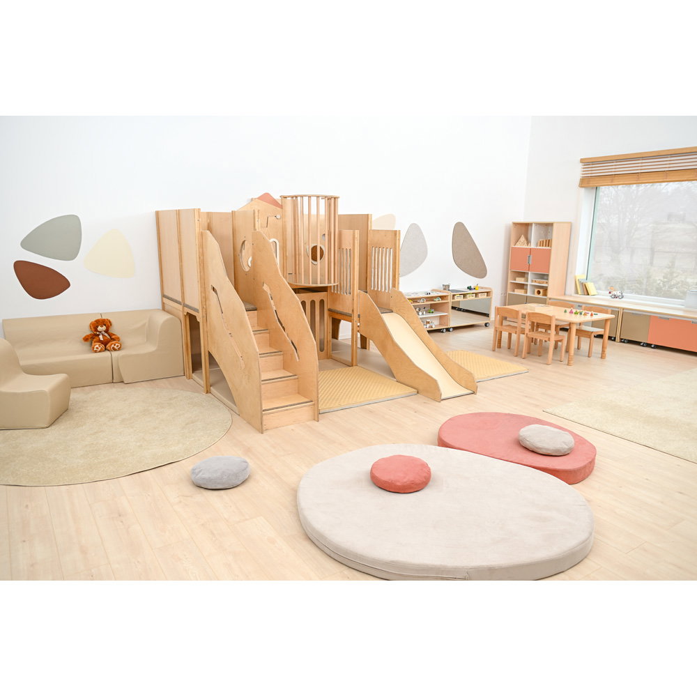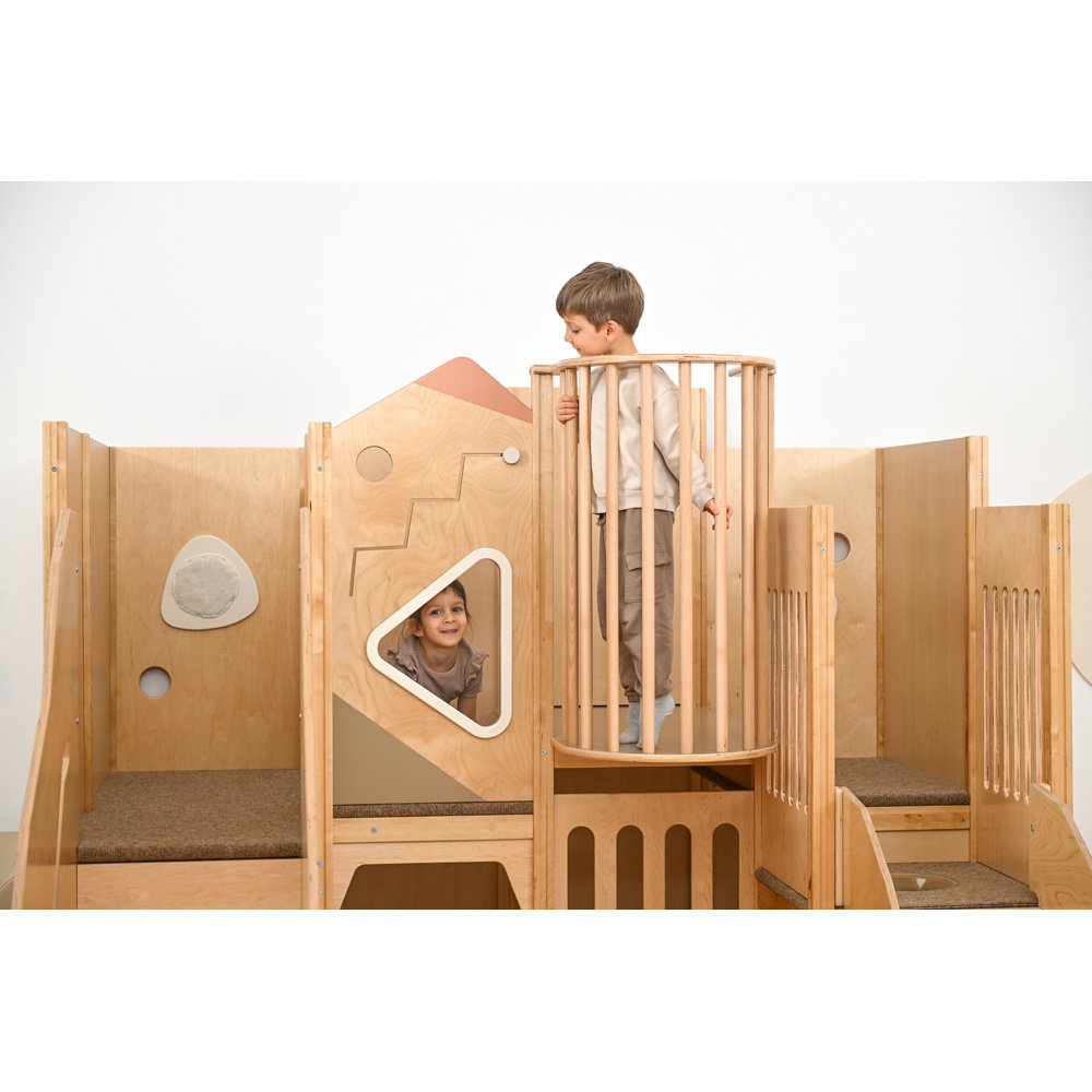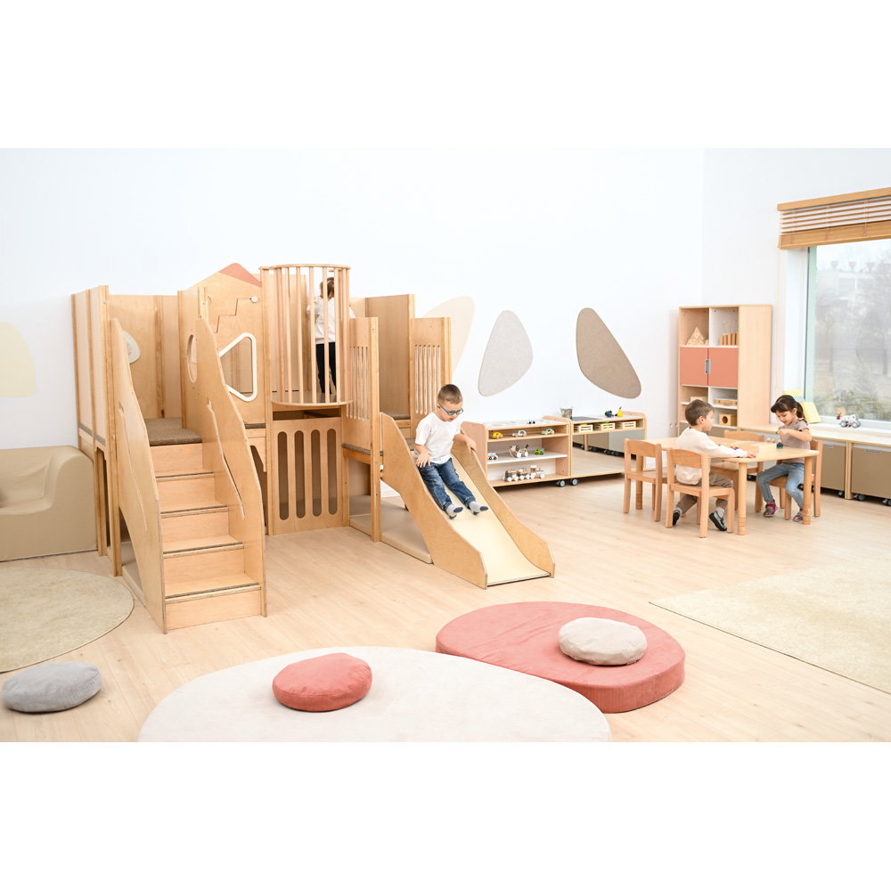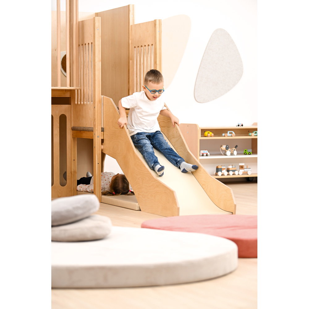 Über eine sichere Treppe erklimmen die kleinen Entdecker verschiedene Ebenen, balancieren über den „Balkon“ und sausen schließlich die robuste Rutsche hinab. Doch nicht nur Bewegung steht im Fokus: Drei integrierte Motoriktafeln an den Wänden fordern die Geschicklichkeit heraus, während gemütliche Ruhezonen mit weichen Matratzen zum Verweilen und Träumen einladen. Die Kombination aus aktivem Toben, kognitiver Förderung und entspanntem Rückzug macht diese Spielecke zum vielseitigen Mittelpunkt des Gruppenraums.
