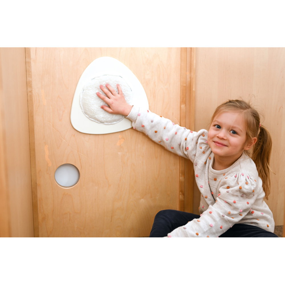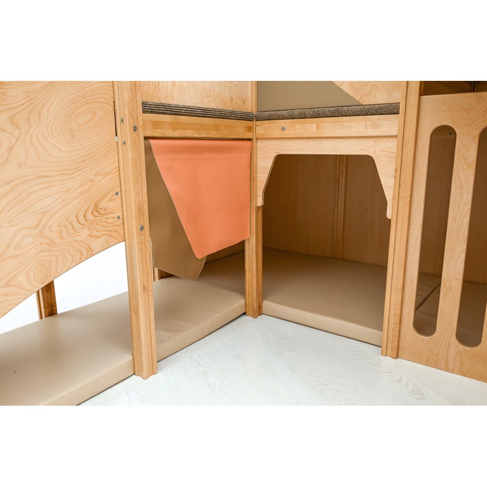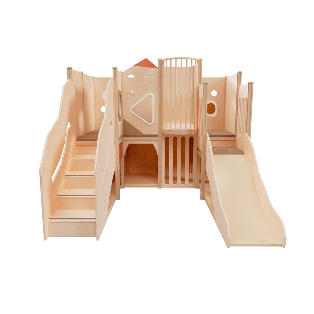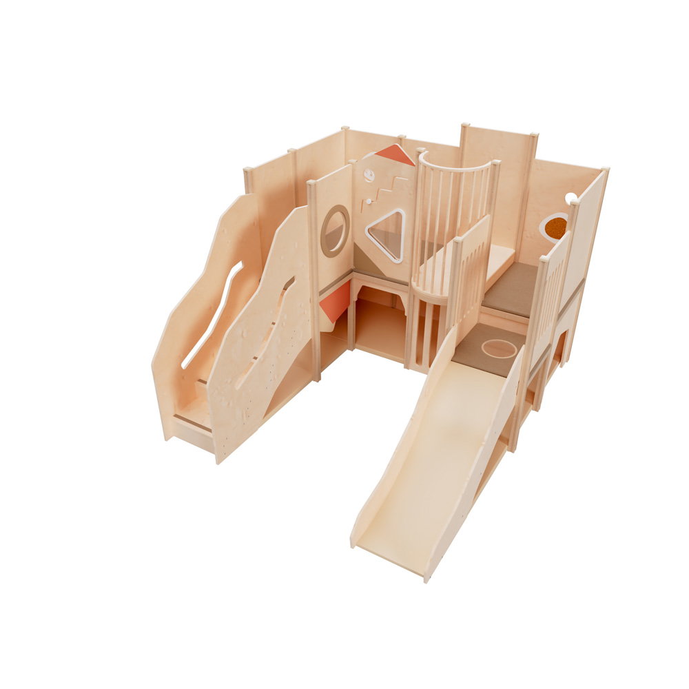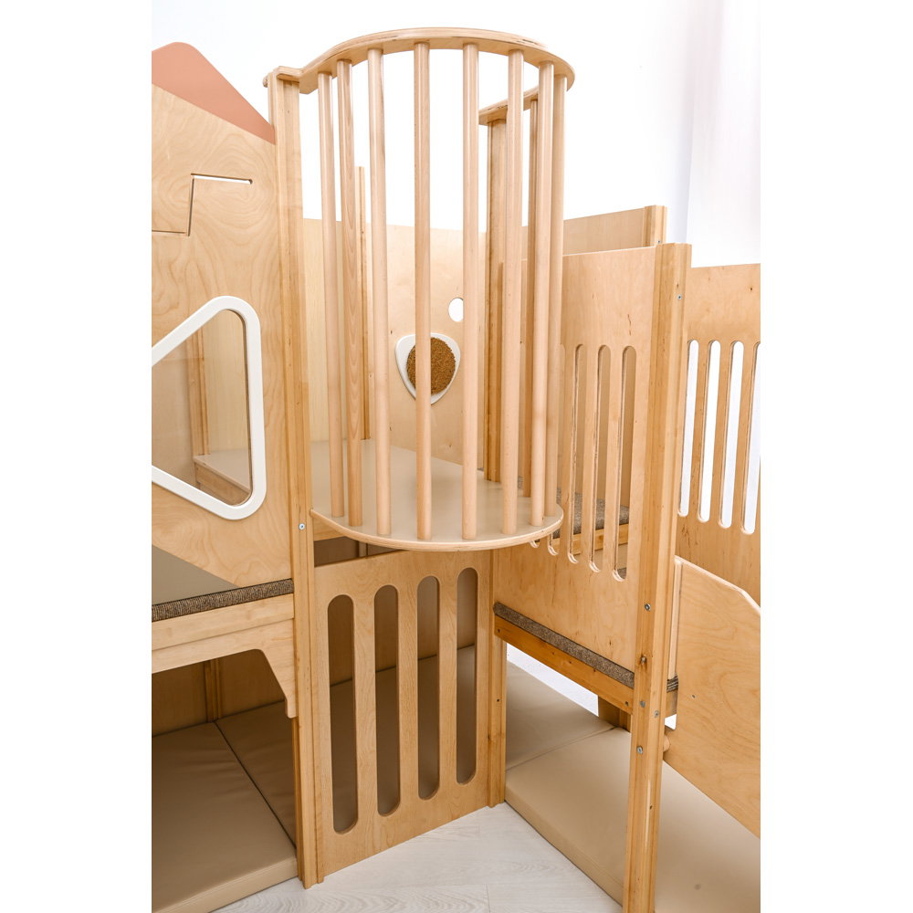 Über eine sichere Treppe erklimmen die kleinen Entdecker verschiedene Ebenen, balancieren über den „Balkon“ und sausen schließlich die robuste Rutsche hinab. Doch nicht nur Bewegung steht im Fokus: Drei integrierte Motoriktafeln an den Wänden fordern die Geschicklichkeit heraus, während gemütliche Ruhezonen mit weichen Matratzen zum Verweilen und Träumen einladen. Die Kombination aus aktivem Toben, kognitiver Förderung und entspanntem Rückzug macht diese Spielecke zum vielseitigen Mittelpunkt des Gruppenraums.