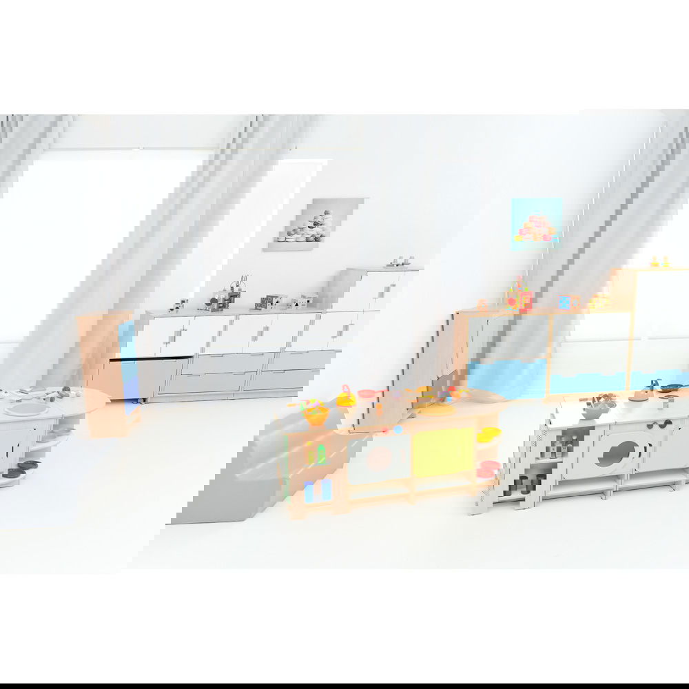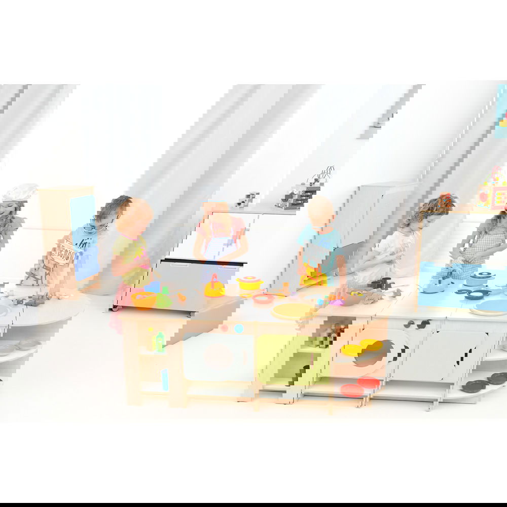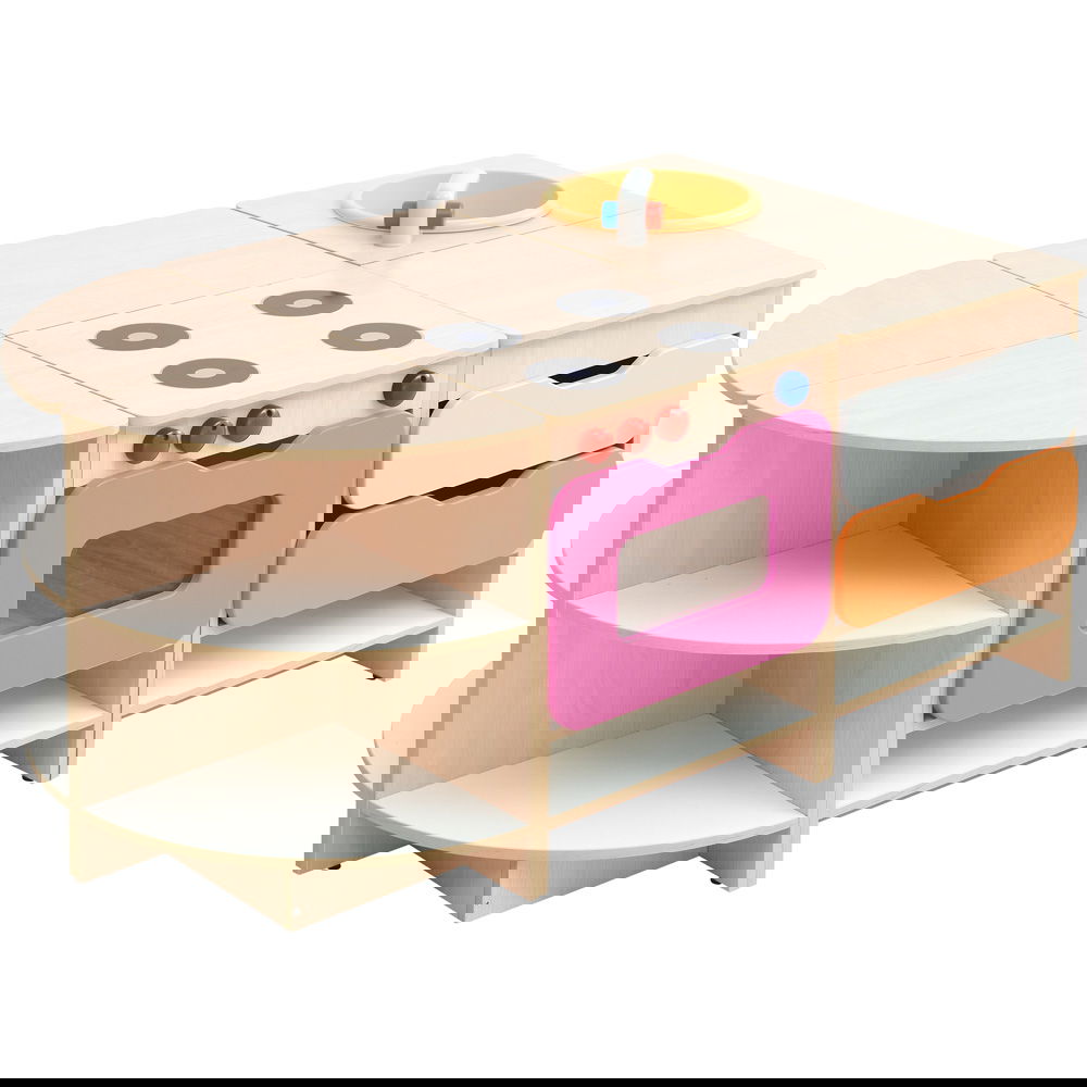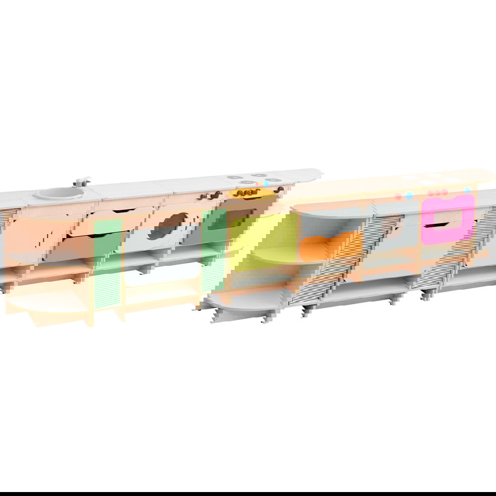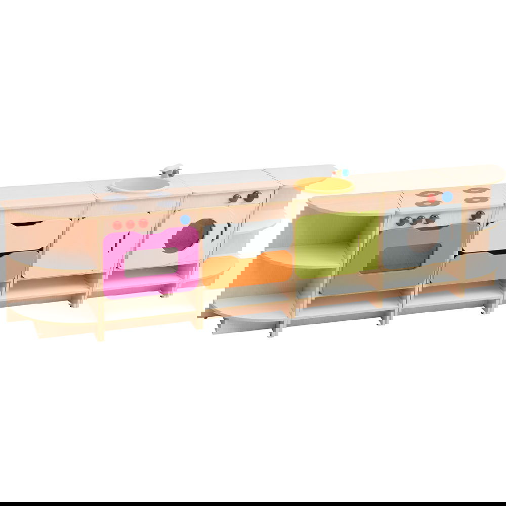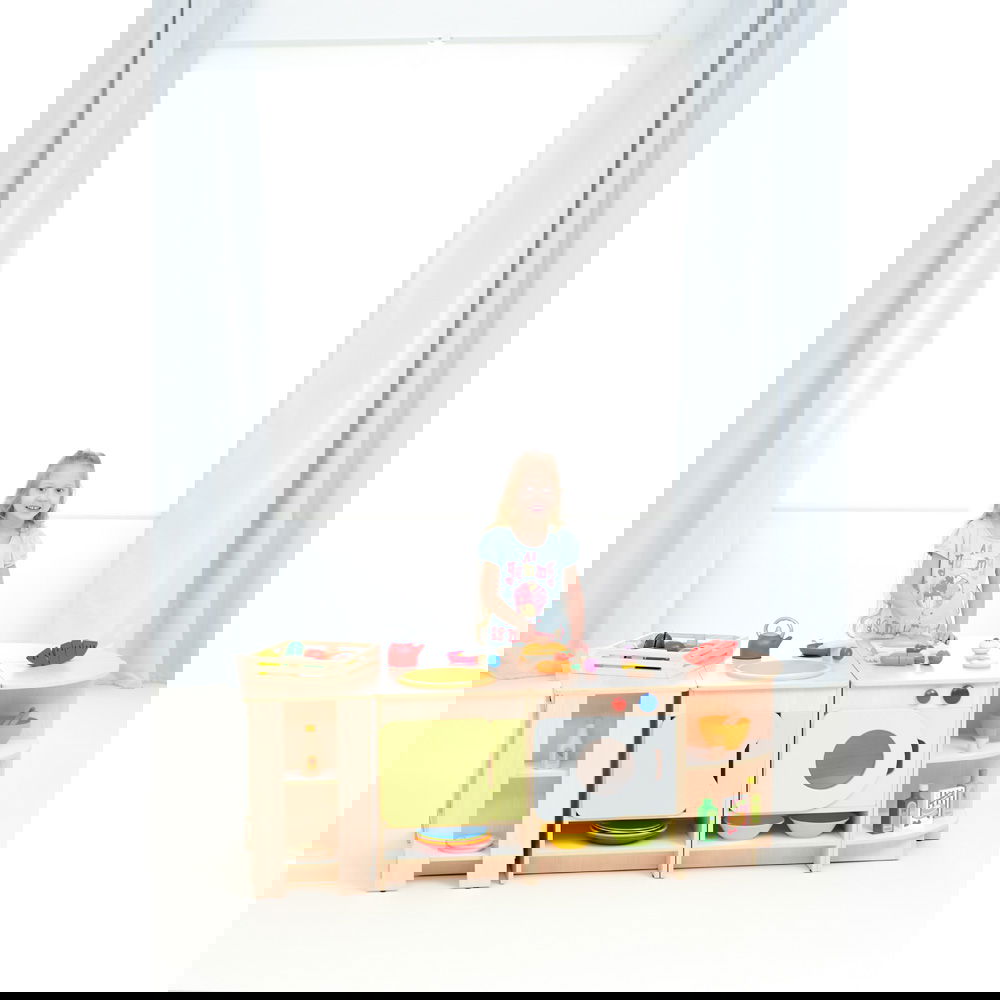 Das Set besteht aus sieben Einzelteilen, die nicht fest miteinander verbunden sind. Das bedeutet, Sie können die Küche jederzeit neu arrangieren. Stellen Sie sie als lange Wandzeile auf (fast 3 Meter Spielspaß!) oder gruppieren Sie die Elemente zu einer Insel, um die Küche von mehreren Seiten zugänglich zu machen. So bleibt das Spielumfeld dynamisch und interessant. - Ordnung und Stauraum