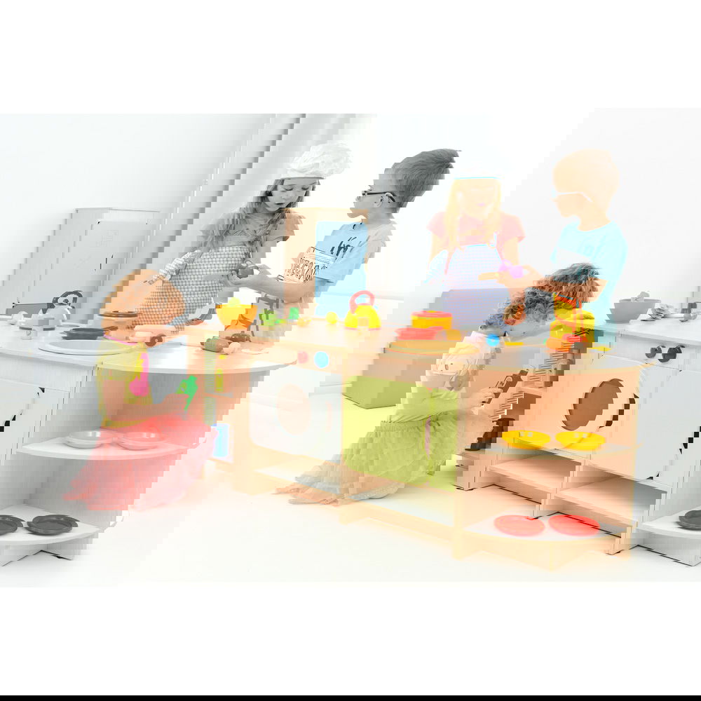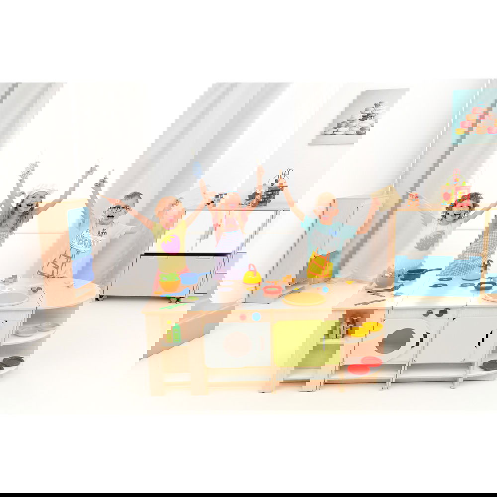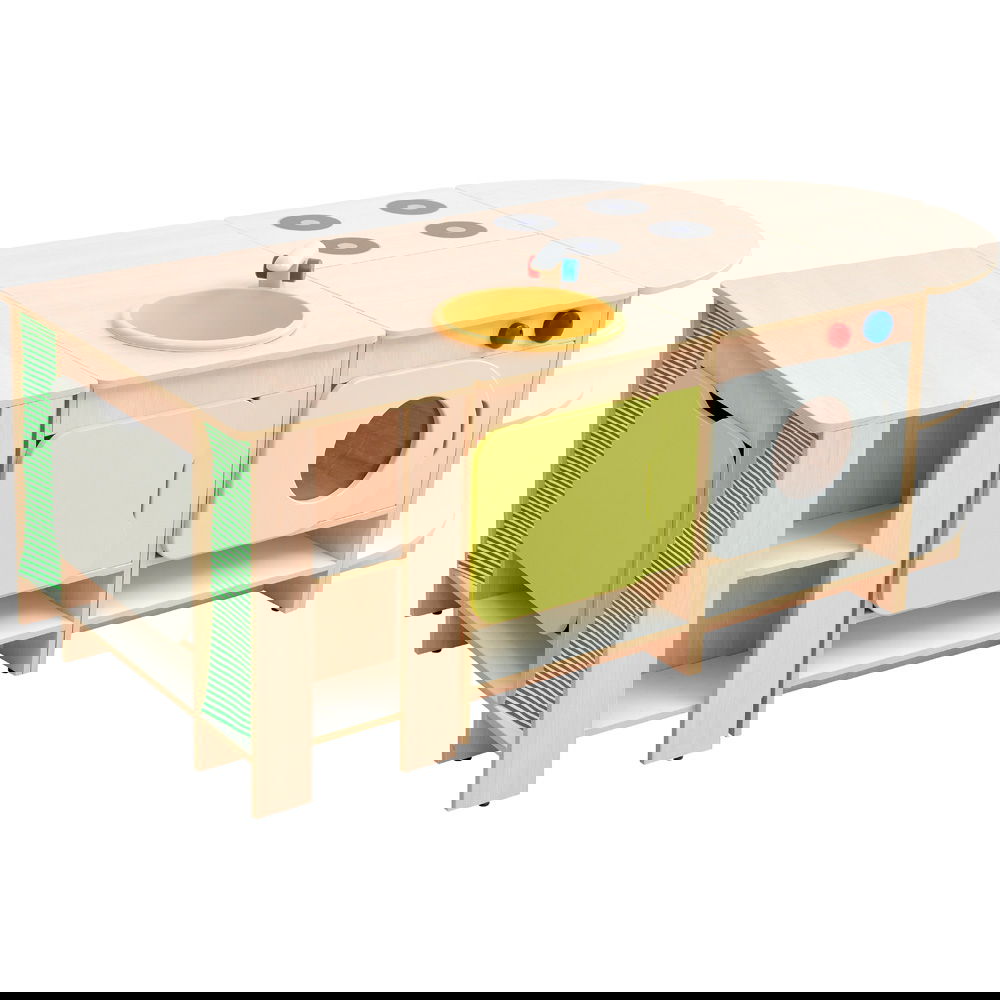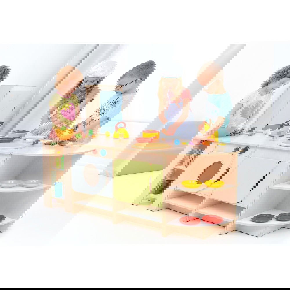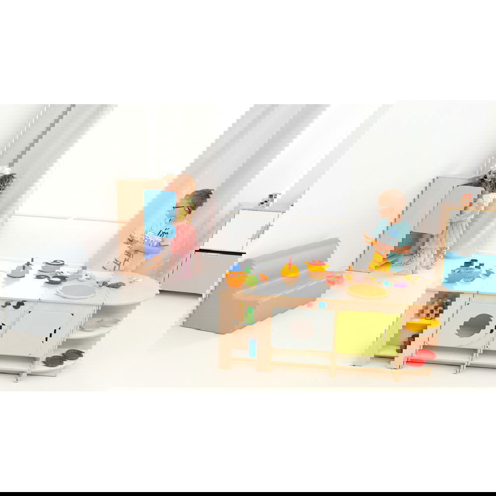 Kinder lieben es, Erwachsene zu imitieren. In dieser Küche können sie kochen, waschen, aufräumen und servieren. Diese Rollenspiele sind essentiell für die Entwicklung sozialer Fähigkeiten, Empathie und Kommunikation. Wer kocht heute? Wer deckt den Tisch? Hier lernen Kinder, sich abzusprechen und gemeinsam zu agieren. - Maximale Flexibilität durch Modulbauweise