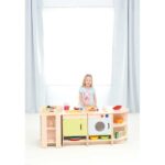 Die Spielecke Küche Quadro bildet eine schöne Spielkulisse für Rollenspiele. Die Möbel sind aus laminierter Spanplatte (12 mm) in Ahorn-Optik, Fronten aus MDF-Platte gefertigt.