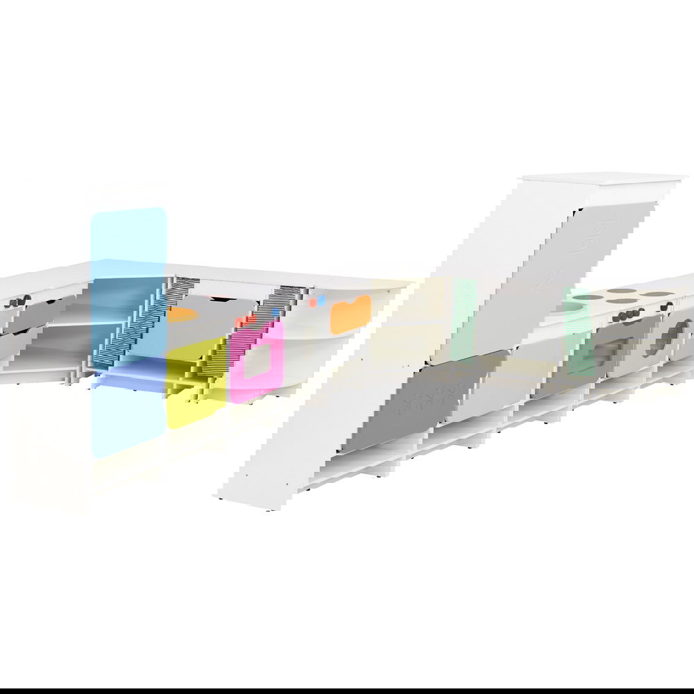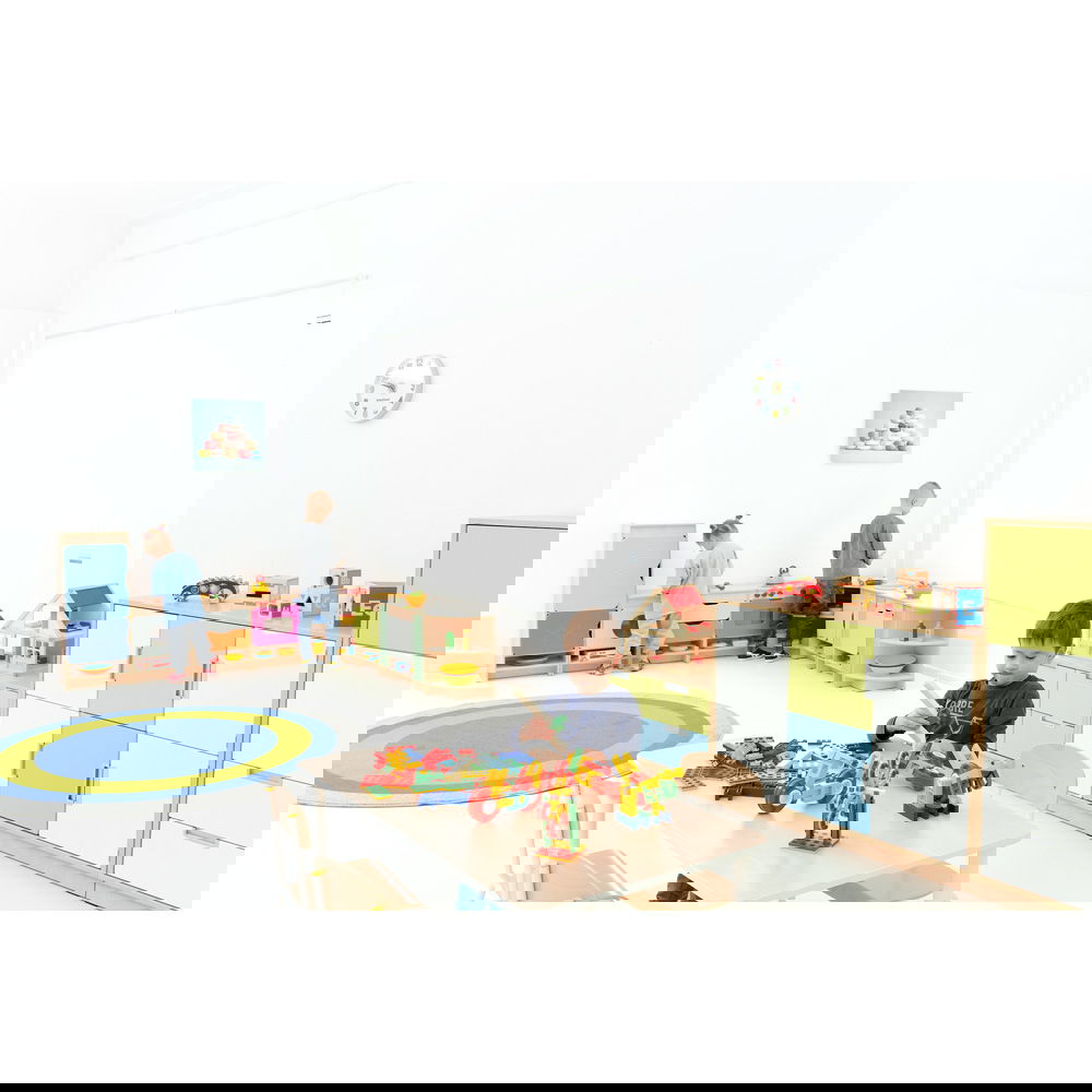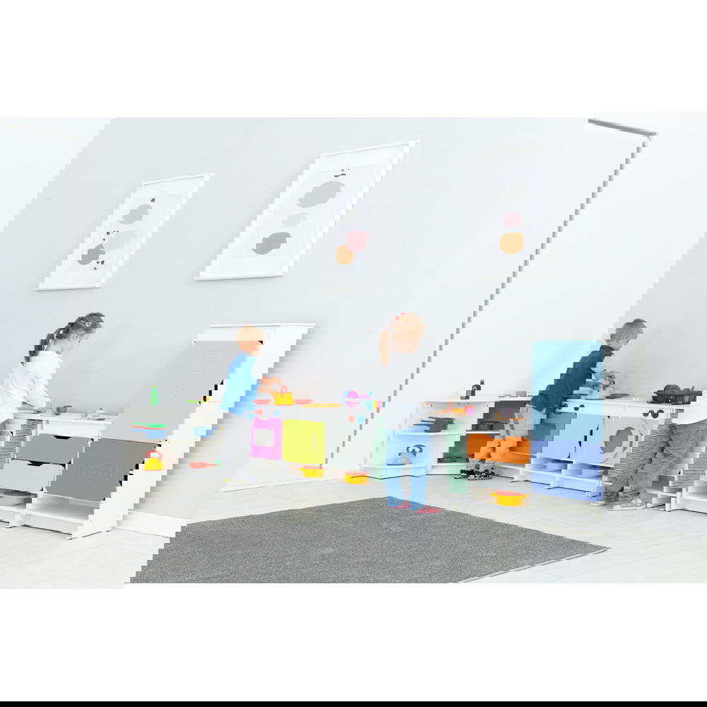 Entwickelt für den intensiven Kita-Alltag, bestehen die Möbel aus 12 mm starker, laminierter Spanplatte. Die Oberflächen sind kratzfest und leicht zu reinigen – ein feuchtes Tuch genügt meistens. Die abgerundeten Kanten und die kippsichere Bauweise sorgen für unbeschwertes Spielvergnügen. - Stauraum für Ordnung im Spielbereich