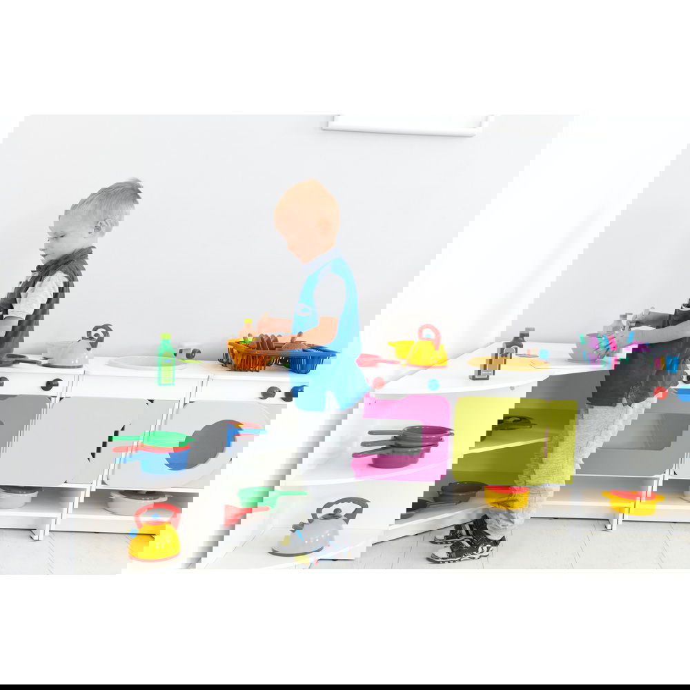 Der Kühlschrank bringt eine neue Dimension in das Spiel: Einkäufe verstauen, Vorräte prüfen, kochen und waschen. Kinder lernen spielerisch die Abläufe eines Haushalts kennen. Das Hantieren mit Türen, Schubladen und Knöpfen schult die Feinmotorik, während das gemeinsame Kochen die soziale Interaktion und Kommunikation fördert. - Maximale Flexibilität bei der Aufstellung