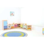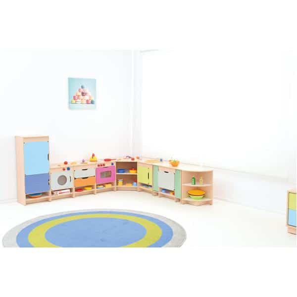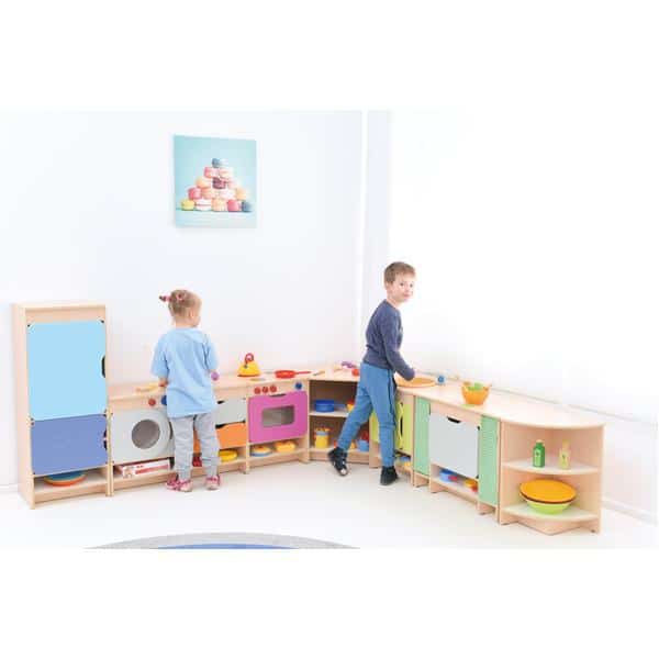Die Spielecke Küche Quadro bildet eine Spielkulisse für Rollenspiele und umfasst 8 Module (Herd, Spüle, Schubladenschrank, Waschmaschine, Kühlschrank, Regalschrank, Eckregal, Eckschrank). Die Möbel sind aus laminierter Spanplatte (12 mm) in Ahorn-Optik, Fronten aus MDF-Platte gefertigt.
