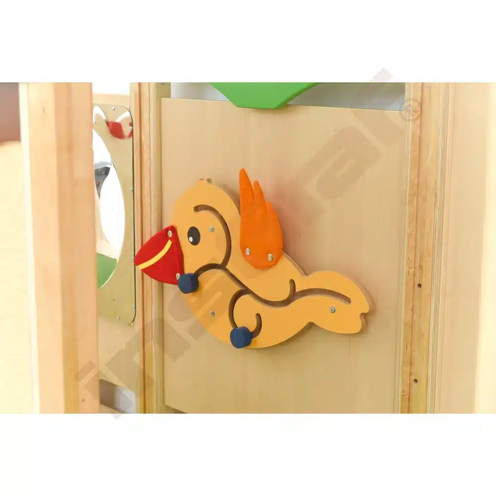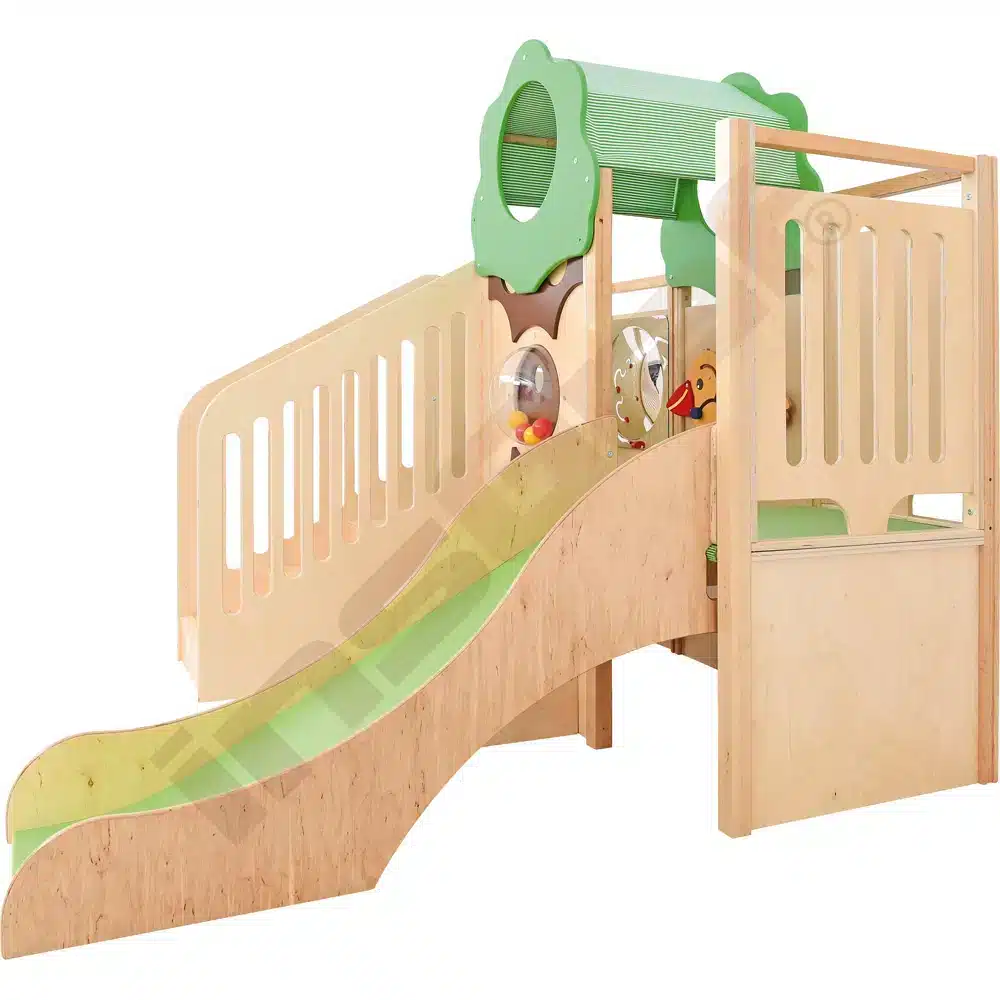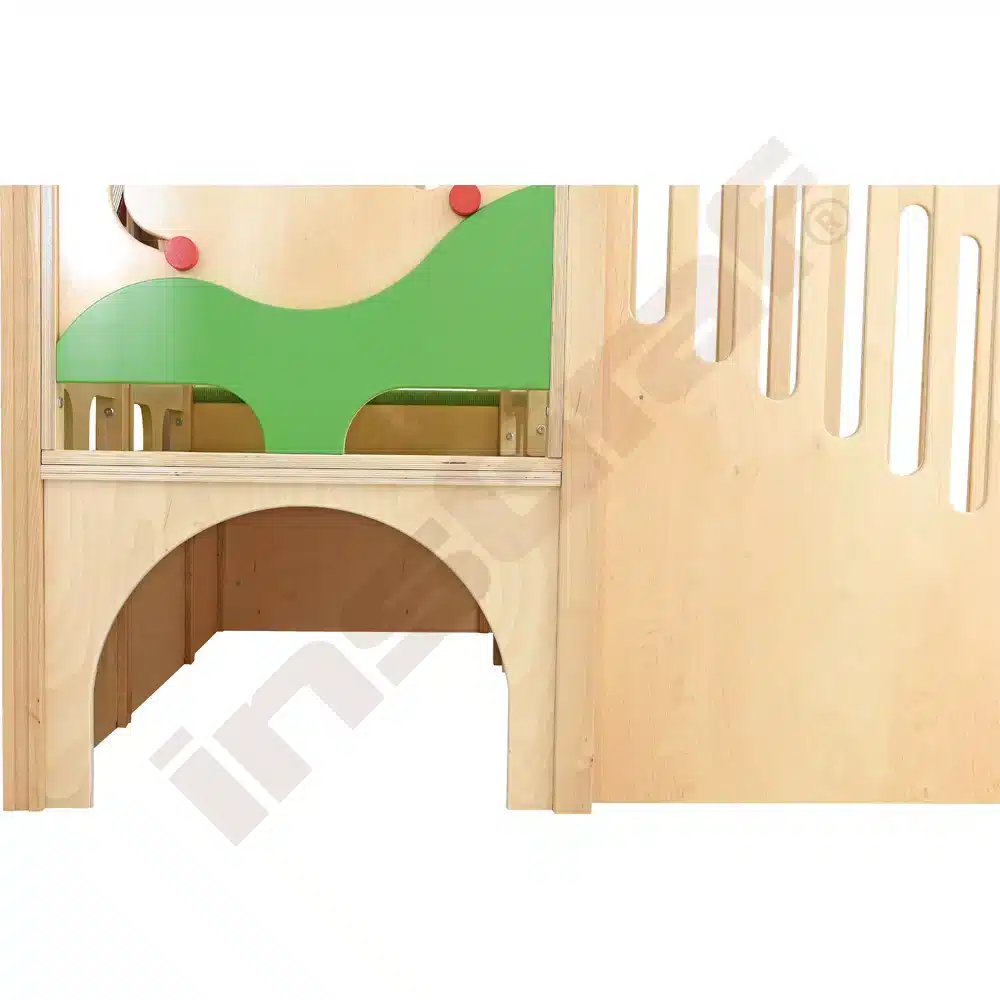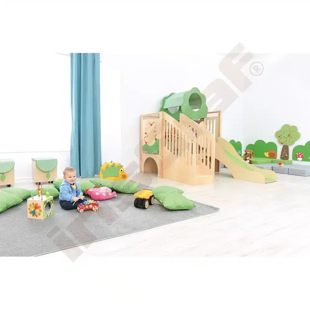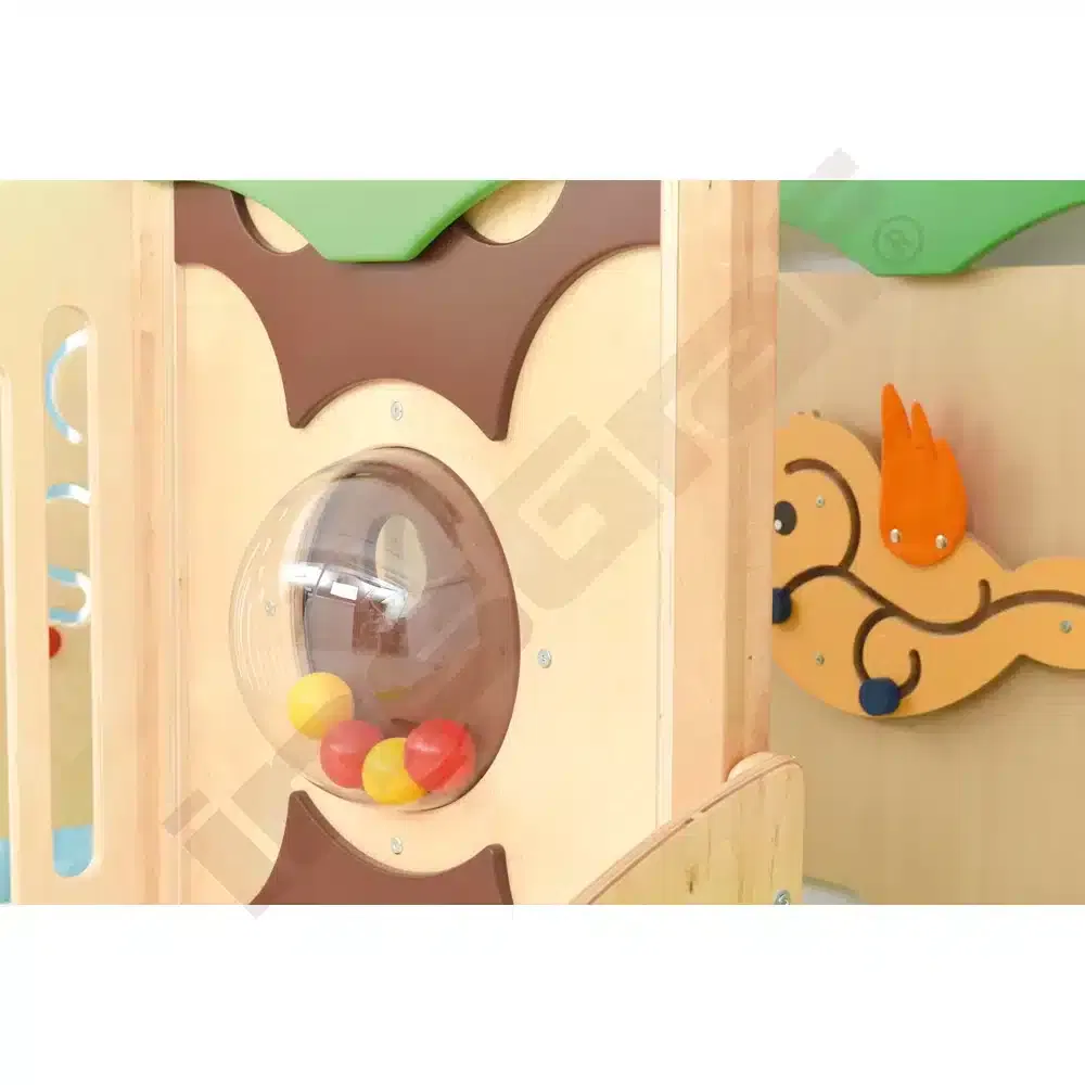 Im Inneren der Spielecke gibt es Schiebespiele, die die Auge-Hand-Koordination fördern, und ein Bullauge, das als Vogelnest mit sammelbaren Eiern gestaltet ist. Ein Tunnel unter dem Podest lädt zum Versteckspiel ein. Die Podeste sind mit rutschfestem tretford-Teppichbelag ausgestattet und die Rutschfläche ist HPL-laminiert und kratzfest.