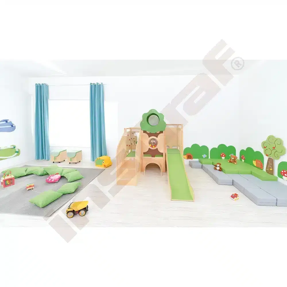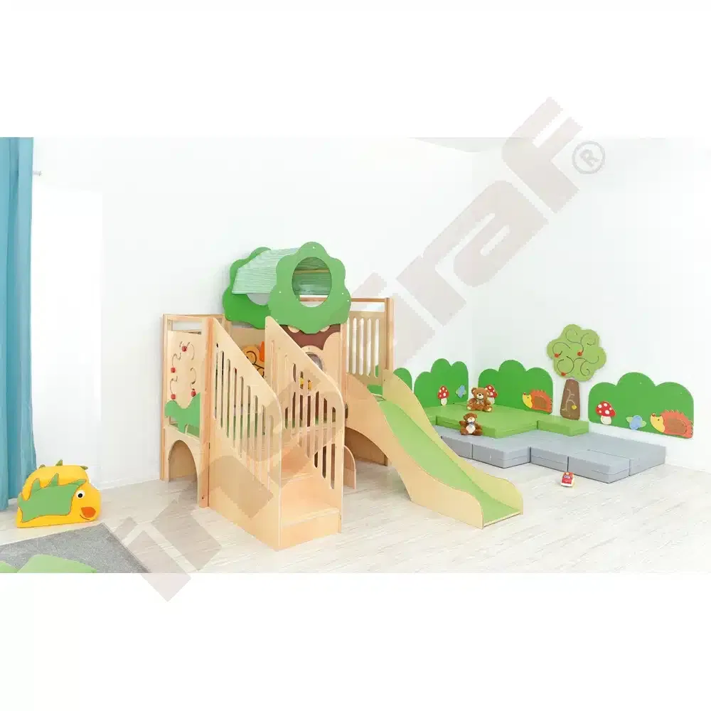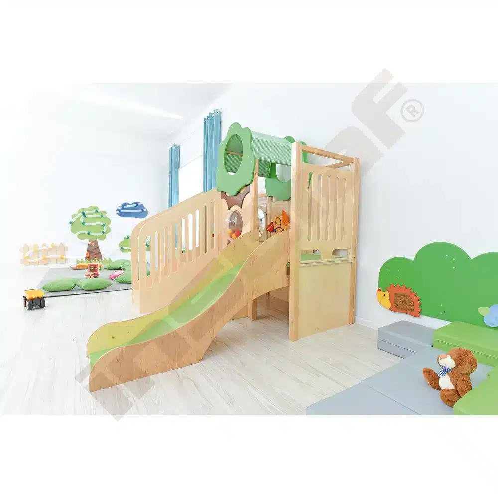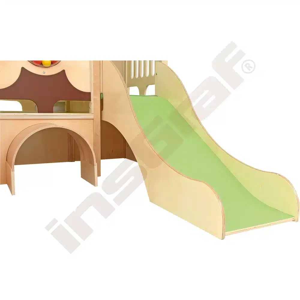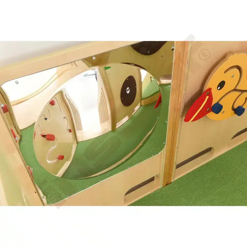 Im Inneren der Spielecke gibt es Schiebespiele, die die Auge-Hand-Koordination fördern, und ein Bullauge, das als Vogelnest mit sammelbaren Eiern gestaltet ist. Ein Tunnel unter dem Podest lädt zum Versteckspiel ein. Die Podeste sind mit rutschfestem tretford-Teppichbelag ausgestattet und die Rutschfläche ist HPL-laminiert und kratzfest.