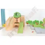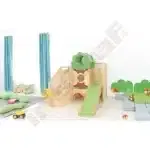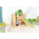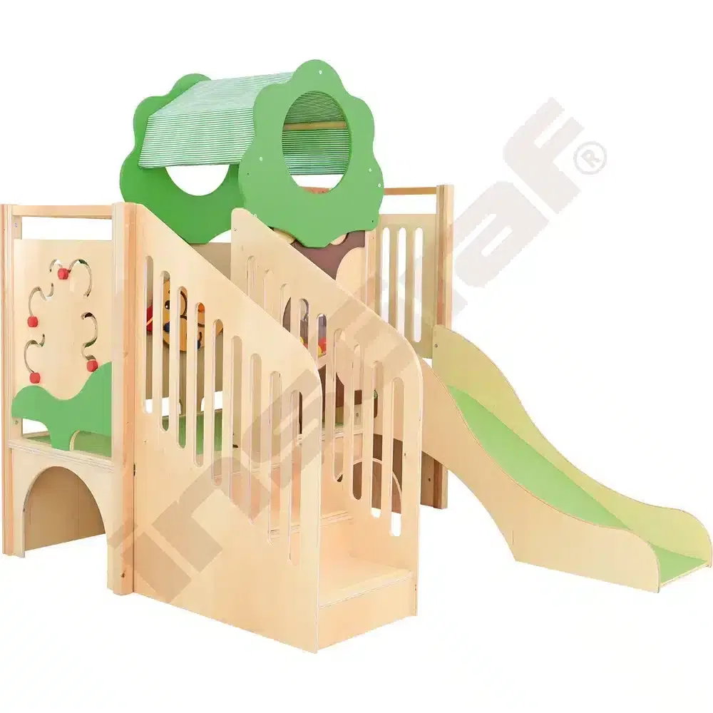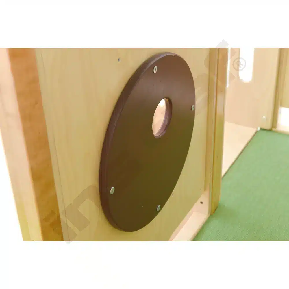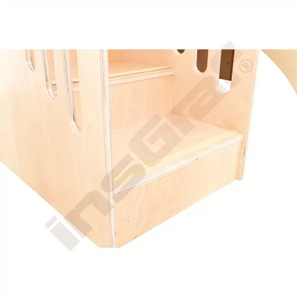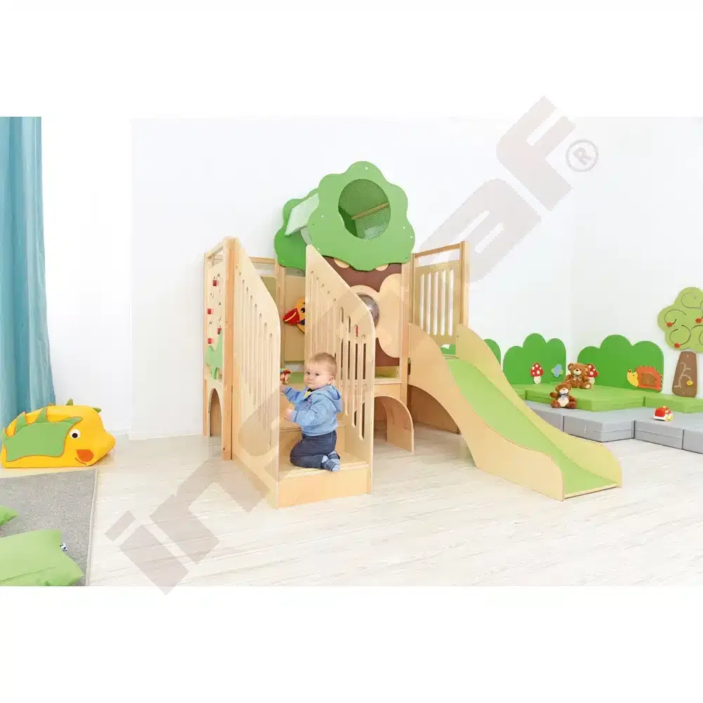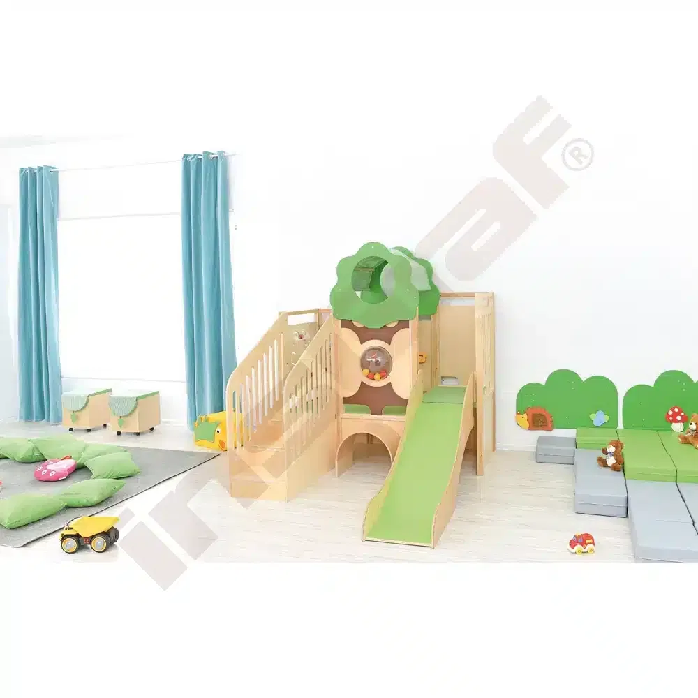 Im Inneren der Spielecke gibt es Schiebespiele, die die Auge-Hand-Koordination fördern, und ein Bullauge, das als Vogelnest mit sammelbaren Eiern gestaltet ist. Ein Tunnel unter dem Podest lädt zum Versteckspiel ein. Die Podeste sind mit rutschfestem tretford-Teppichbelag ausgestattet und die Rutschfläche ist HPL-laminiert und kratzfest.