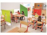 Der Stuhl, der sich an das Kind anpasst! Indem Sie nur 2 Schrauben versetzen, passen Sie die Höhe des Stuhls entsprechend der Größe des Kindes an. Kann zur einfacheren Bodenreinigung auf den Tisch gestellt werden. Schutzgleiter, um zu vermeiden, dass die Sitzfläche und die Tischplatte beim Stapeln zerkratzt werden.