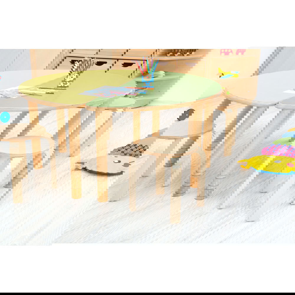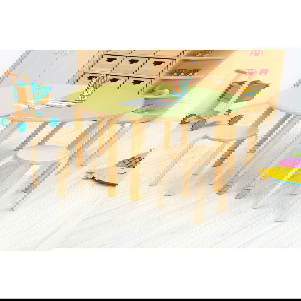 Für die Sicherheit der Kinder ist bestens gesorgt. Alle Kanten und die komplette Rundung der 25 mm starken Tischplatte sind sorgfältig abgerundet, um Verletzungen vorzubeugen. Die massiven Tischbeine (Ø 55 mm) werden mit stabilen Metallringen befestigt, die für einen dauerhaft festen und wackelfreien Stand sorgen. - Fördert Gemeinschaft und Kommunikation