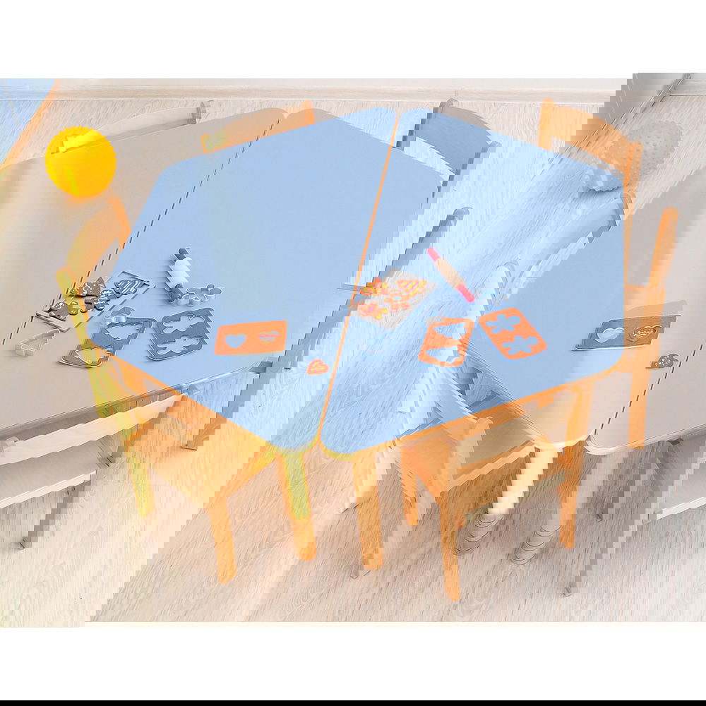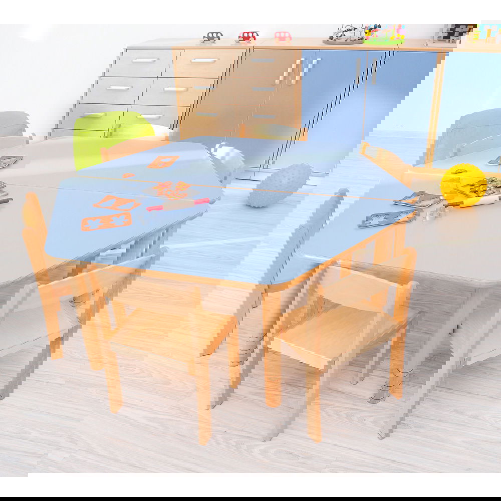 Die HPL-beschichtete Tischplatte ist das Beste, was einem Kita-Tisch passieren kann. Sie ist extrem kratz- und stoßfest und lässt sich mühelos reinigen. Selbst intensive Nutzung mit Bastelmaterialien wie Farben, Scheren oder Kleber hinterlässt keine Spuren. - Sicherheit und Stabilität an erster Stelle