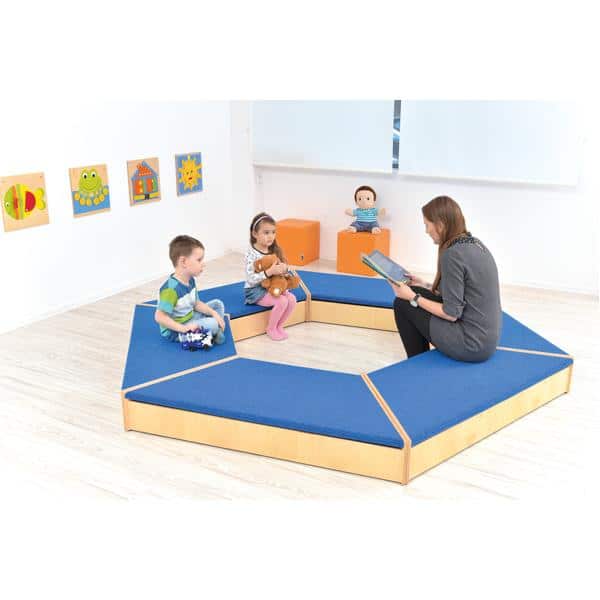 Ob Sechseck, gerade Linie oder offener Halbkreis – mit den Trapezpodesten lassen sich viele Landschaften gestalten. Die Podeste können als Spielebene, Sitzlandschaft oder Bühne genutzt werden. Als Sechseck aufgestellt ergibt sich ein Außendurchmesser von 272 cm.