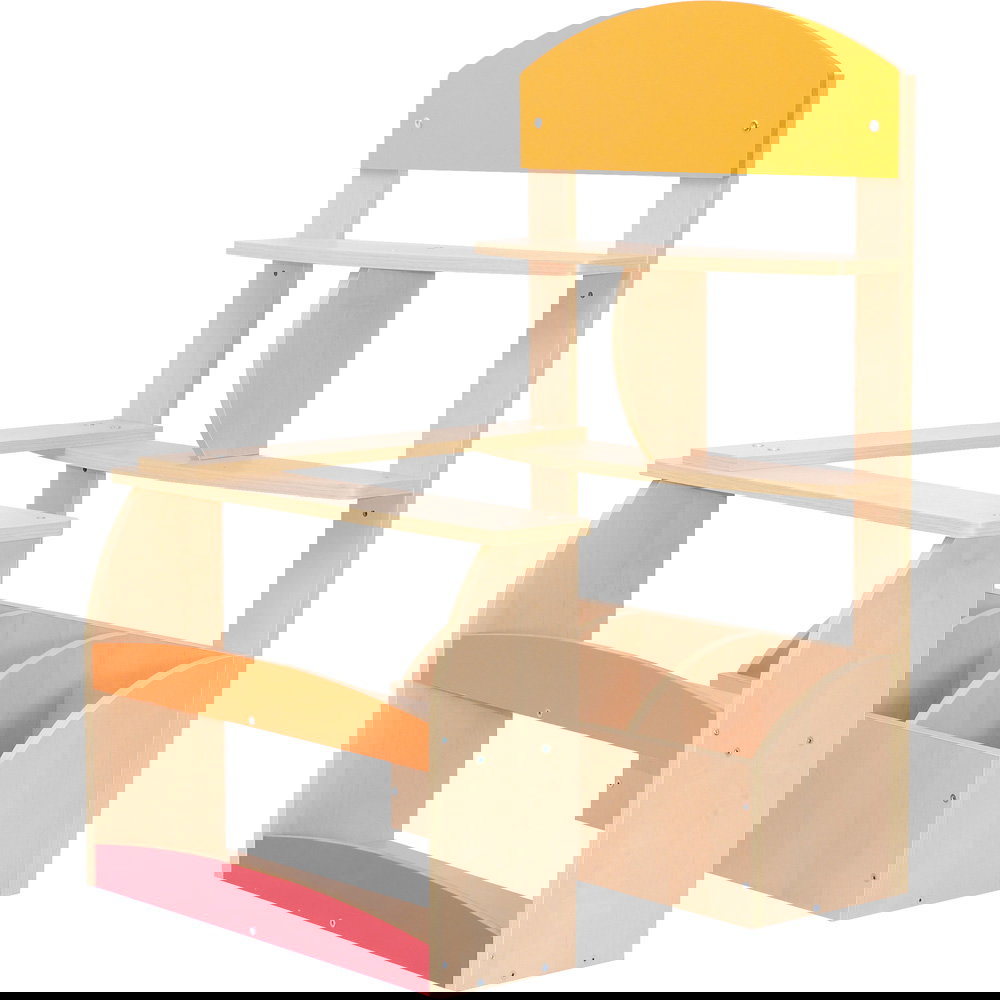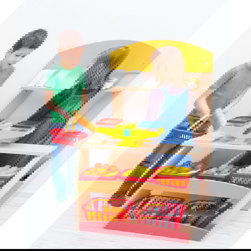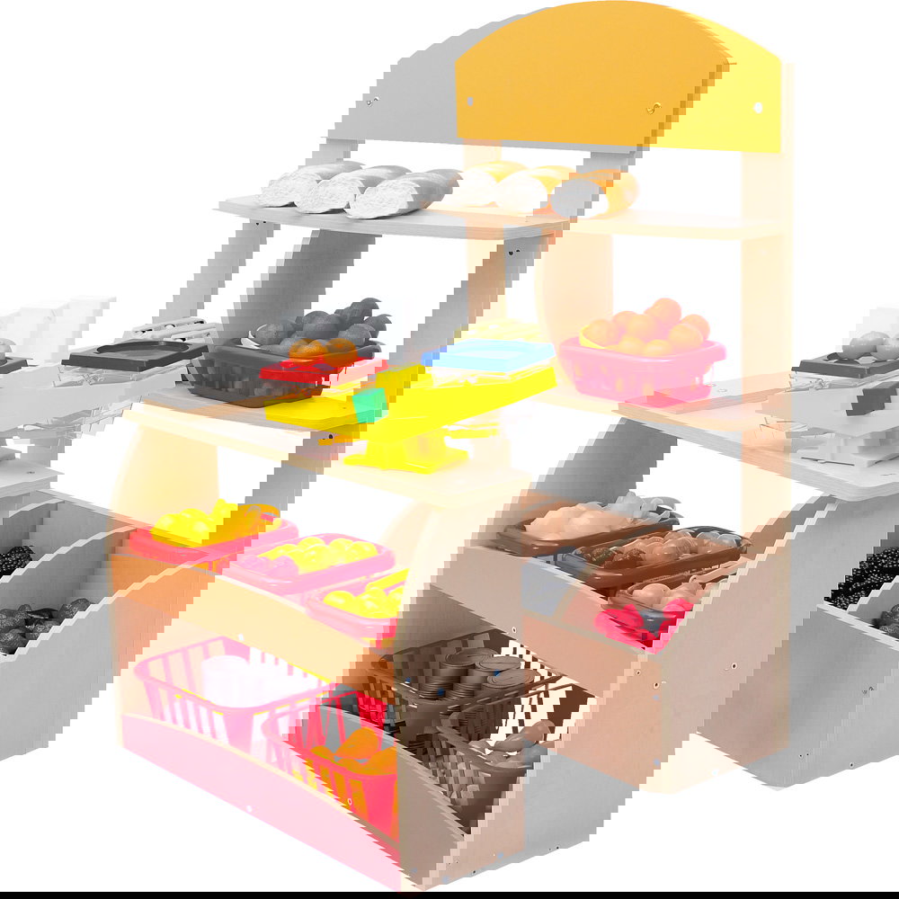Das Design besticht durch eine freundliche Kombination aus heller Ahorn-Optik und farbigen Akzenten aus MDF, die den Kiosk modern und einladend wirken lassen. Dank seiner durchdachten Aufteilung finden hier Waren aller Art ihren Platz: Die Rückwand und der Verkaufstisch sind mit unterschiedlich großen Fächern ausgestattet, sodass Obst, Gemüse, Backwaren oder Spielzeug ordentlich präsentiert werden können. Die ideale Höhe des Ladentisches von 52 cm ermöglicht es den kleinen Verkäufern, auf Augenhöhe mit ihren „Kunden“ zu verhandeln, Geld zu zählen und Waren über den Tresen zu reichen.