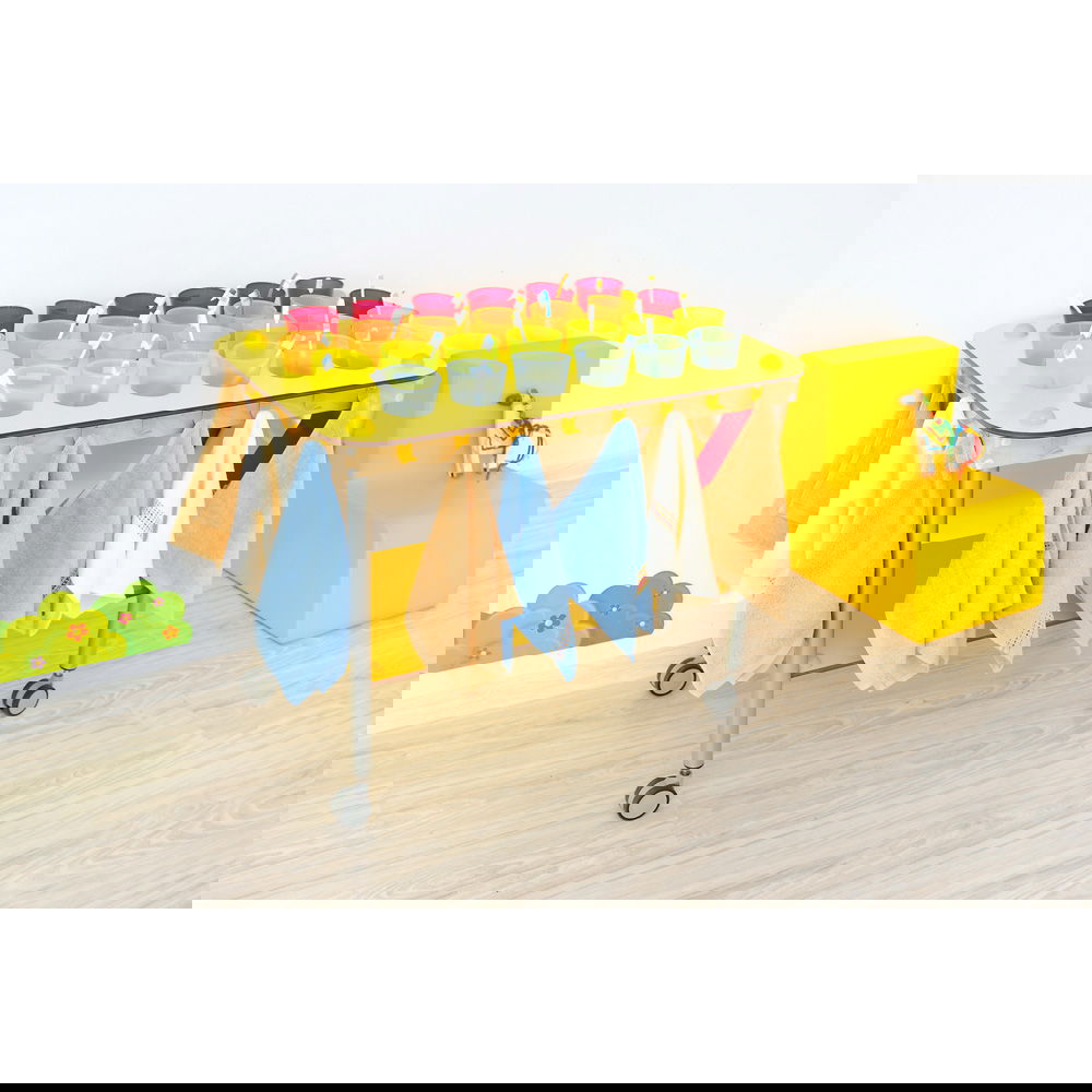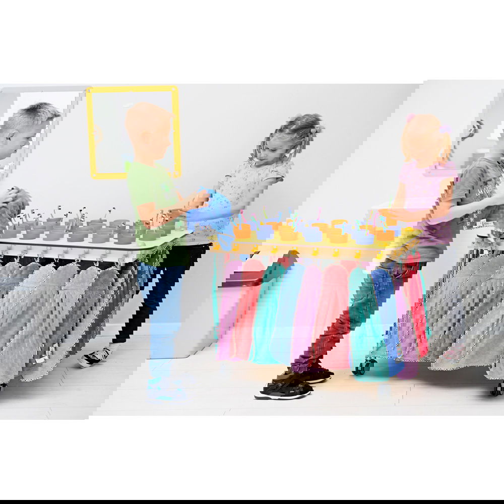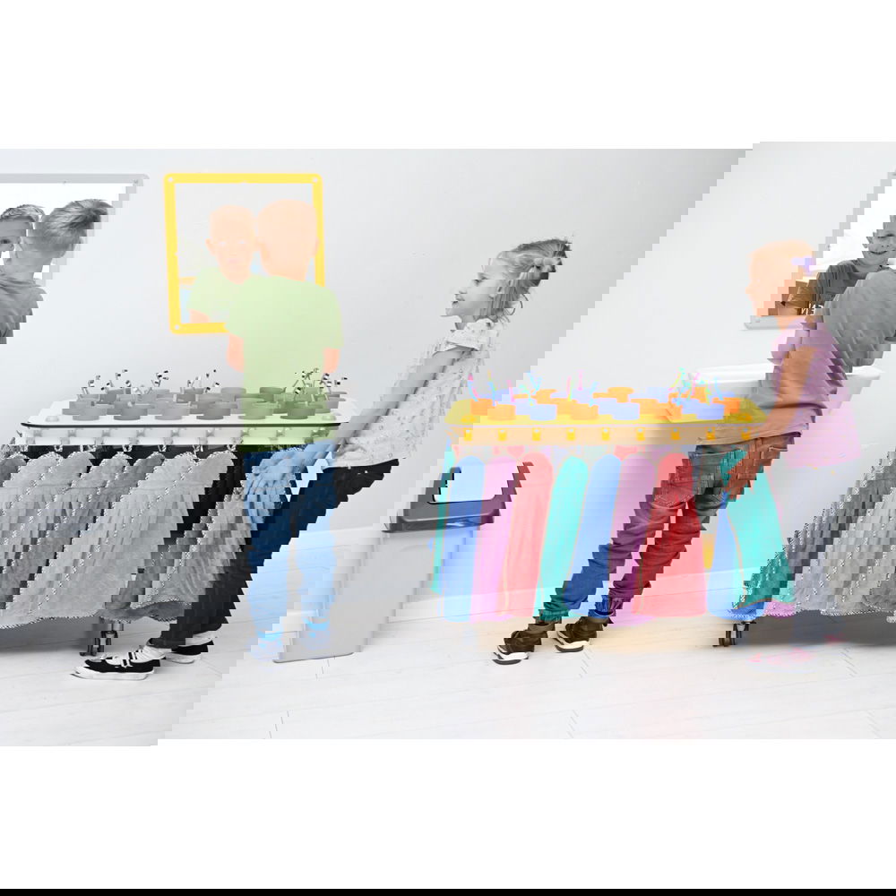 Unterhalb der Becher-Ebene bietet eine großzügige Ablagefläche (B 72,5 x T 40 cm) viel Stauraum für alles, was sonst noch benötigt wird. Ob Vorratsboxen mit Zahnpasta, Papierhandtücher oder didaktisches Material zum Thema Zahngesundheit – hier ist alles griffbereit verstaut, ohne die Arbeitsfläche zu blockieren. - Fördert Ordnung und Selbstständigkeit