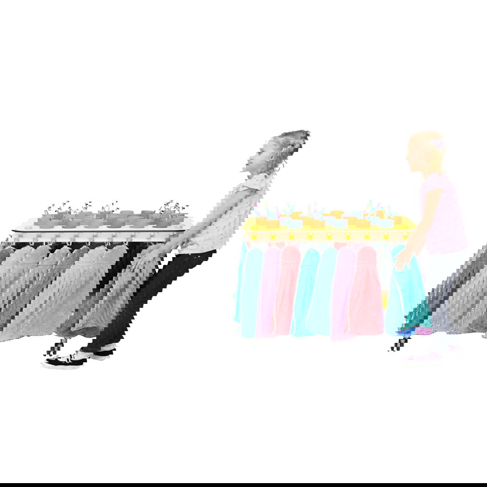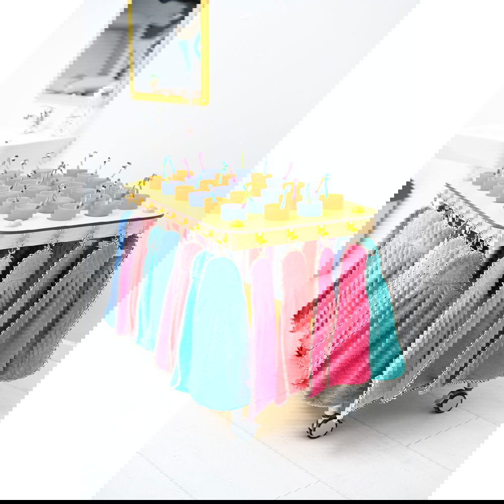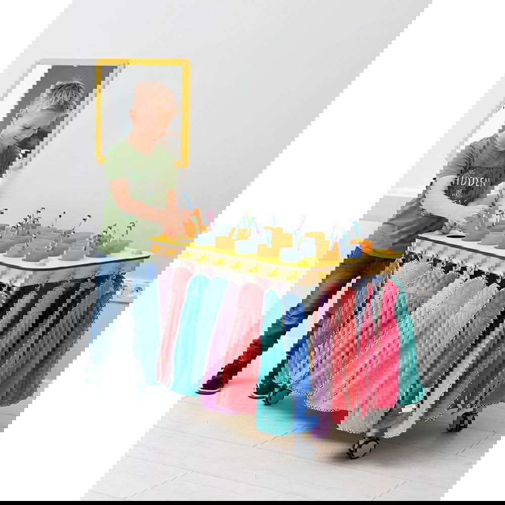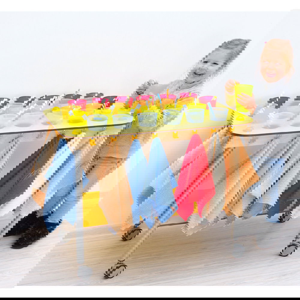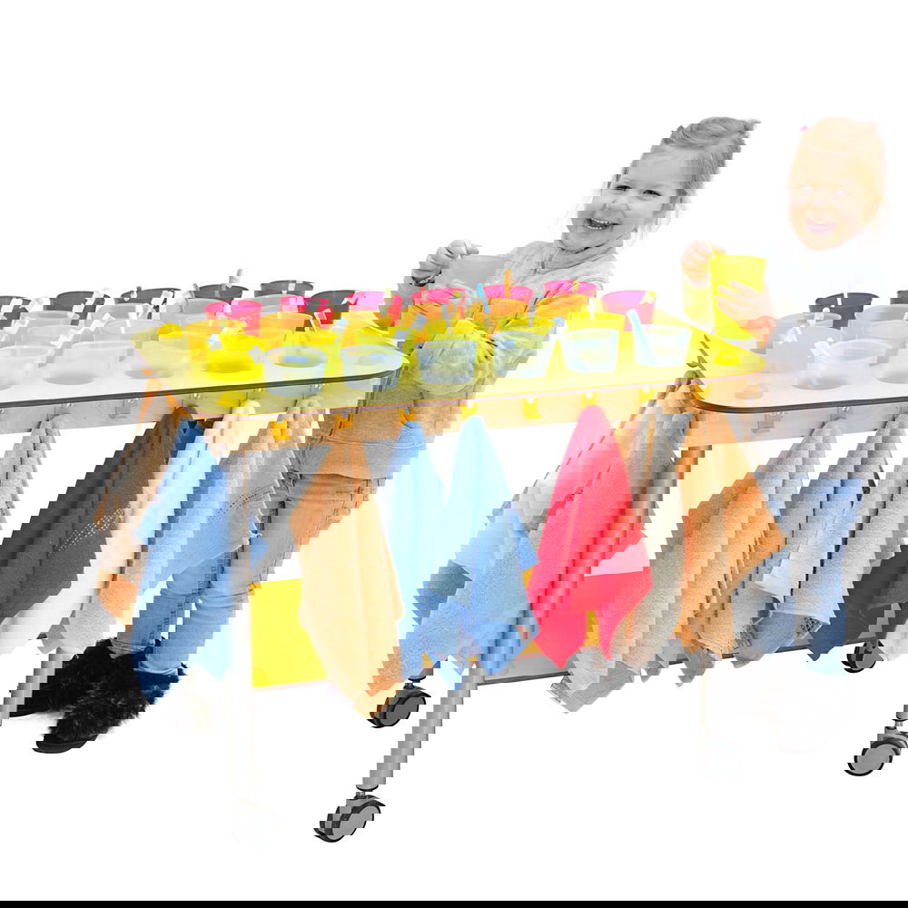 Dieser Wagen wurde speziell für größere Gruppen konzipiert und überzeugt durch seine robuste Bauweise und absolute Wasserfestigkeit. Gefertigt aus widerstandsfähigem HPL-Material, trotzt er täglichem Spritzwasser und feuchten Handtüchern mühelos. Dank seiner vier feststellbaren Rollen lässt er sich flexibel bewegen: Rollen Sie ihn zur „Zahnputzzeit“ in die Mitte des Geschehens und parken Sie ihn anschließend platzsparend an der Wand. Erhältlich in den Varianten Gelb und Grau, bringt er entweder fröhliche Farbe oder zeitlose Eleganz in Ihre Einrichtung.