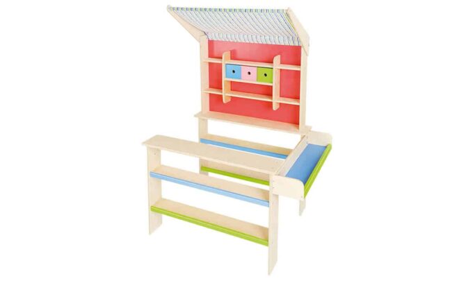 - Robuste Materialien: Hergestellt aus Birken-Schichtholz und mit einem bunten, kinderfreundlichen Design, ist der Kaufladen stabil und langlebig. Das hübsche Stoffdach sorgt für einen einladenden Look und schützt die Waren.
