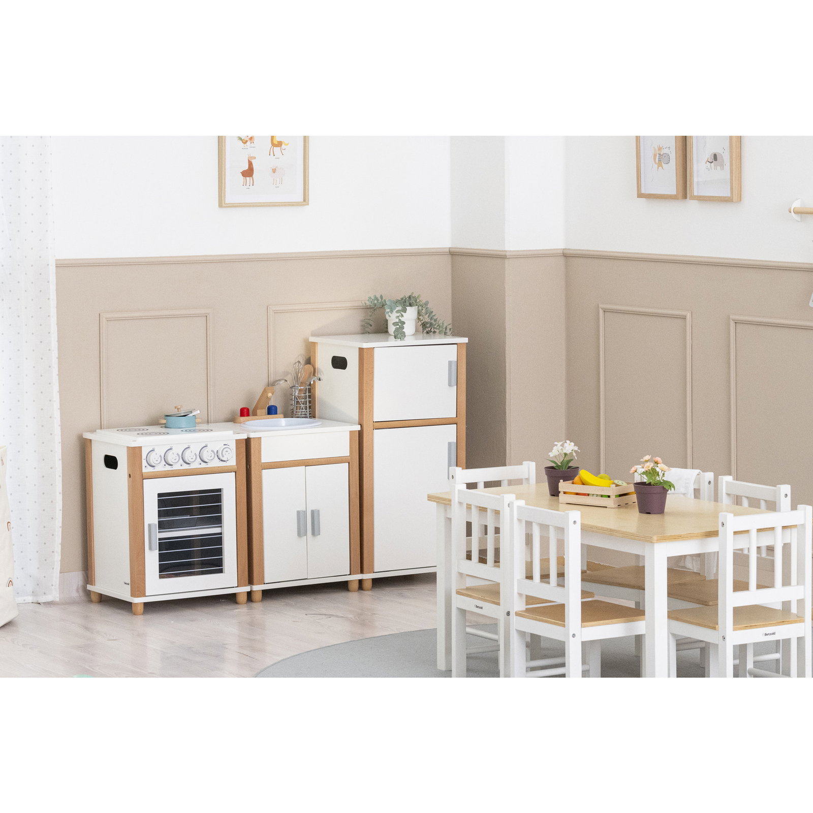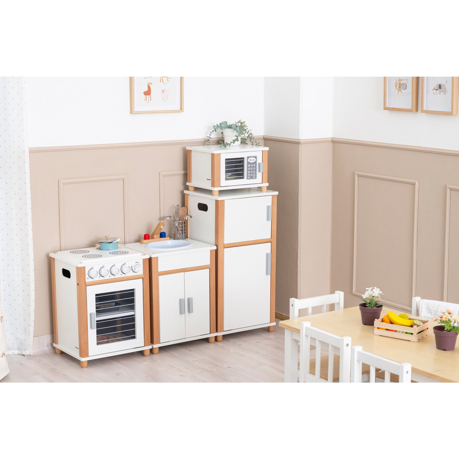 Die Küche besticht durch ihre intelligente Raumaufteilung: Auf 1,20 Metern finden alle essentiellen Küchengeräte – Herd, Backofen, Kühlschrank und Spülbecken – ihren Platz. Das moderne, schlichte Design in Weiß und Naturoptik fügt sich harmonisch in jede Umgebung ein und lenkt den Fokus ganz auf das kreative Spiel. Dank der robusten Verarbeitung aus hochwertigen Materialien ist diese Küche ein langlebiger Begleiter, der auch dem intensiven Einsatz in Gruppenräumen problemlos standhält.