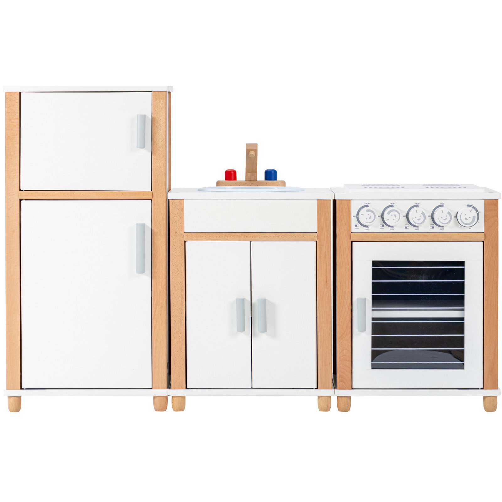 - Robuste Konstruktion: Gefertigt aus solidem MDF und Holz-Elementen, ist die Küche stabil und standfest. Die Oberflächen sind pflegeleicht und widerstandsfähig.